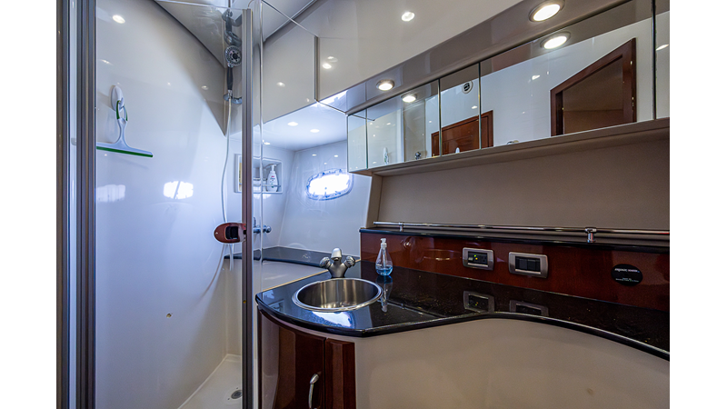 The exterior showcases Italian-inspired elegance with a sleek profile and an expansive, air-conditioned flybridge. Enjoy the choice between cool comfort or the refreshing open air while cruising- a perfect setup for both relaxation and entertaining.