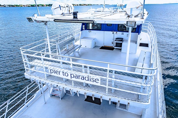 She is equipped with twin Lugger 700hp Diesel Engines that offer a cruising speed of 11 knots and top speed of 20 knots. If you need air conditioning while anchored out, there is a Northern Lights 20kw generator. The captain is meticulous with mechanics so service records are current and complete. This vessel is very solid with an aluminum hull, and she will cut through 4′ to 6′ chop with no problem. The bridge helm is equipped with a complete electronics package including two Garmin GPS screens, Garmin Radar, Robertson Auto Pilot and Rudder Indicator. In addition, there is a separate docking station to Port and another docking station to Starboard so your captain can maneuver this big cat with ease.