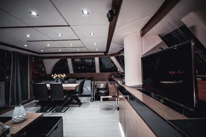 HAPPY Sunreef 60 Loft offers generous deck and cabin layouts, providing a truly comfortable and luxurious experience. The spacious aft cockpit is perfect for outdoor gatherings, while the open sun deck at the bow features a cushioned sunbathing area for relaxation. Additionally, the inviting flybridge houses the helm and offers another seating arrangement for optimal comfort.