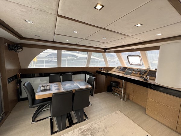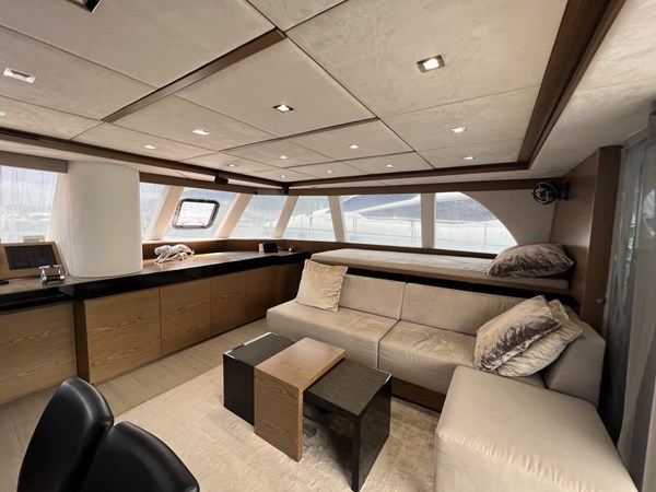 Below deck, HAPPY features an elegant interior with an abundance of natural light. The layout comprises a master cabin with an en suite jacuzzi and a queen size bed, along with two double cabins, each with its own en suite bathroom. The salon is exceptionally bright, offering a 360° panoramic view.