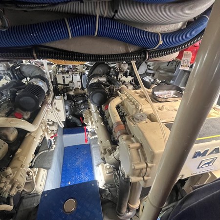 Helm deck level features steering station, opening bimini top, U-shaped seating with table & sink. Aft is sundeck and tender garage with davit/passerelle. Forward is bow with sunbathing area and access to anchor locker. Full navigation electronic package. Ultra sonic system to prevent barnacles. Forward & aft thrusters with remote. 60″ HD TV main salon. 30″ HD TV master cabin. Large refrigeration full equipped galley with microwave. All heads vacuum flush. 4 A/C units including engine room. 30 mile radar Garman GPS with large heads up display.