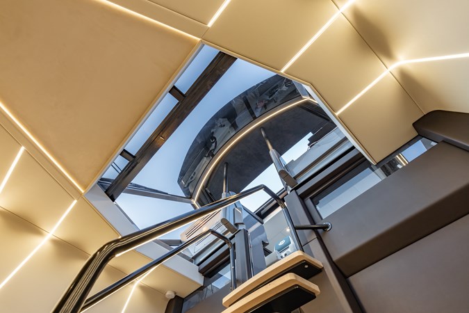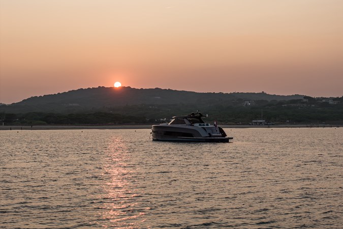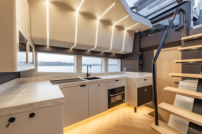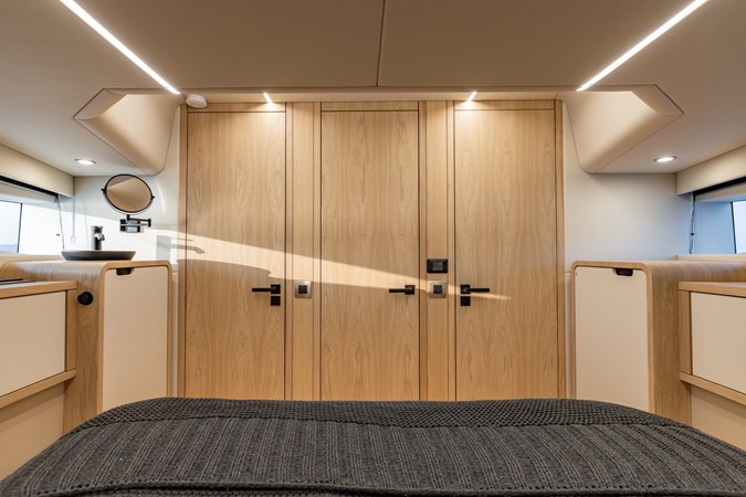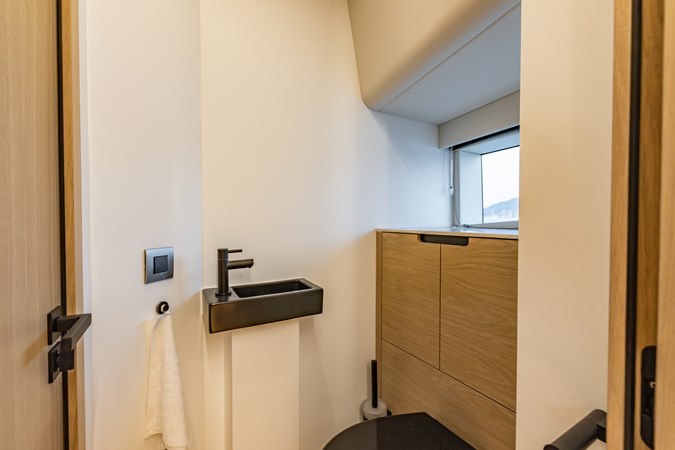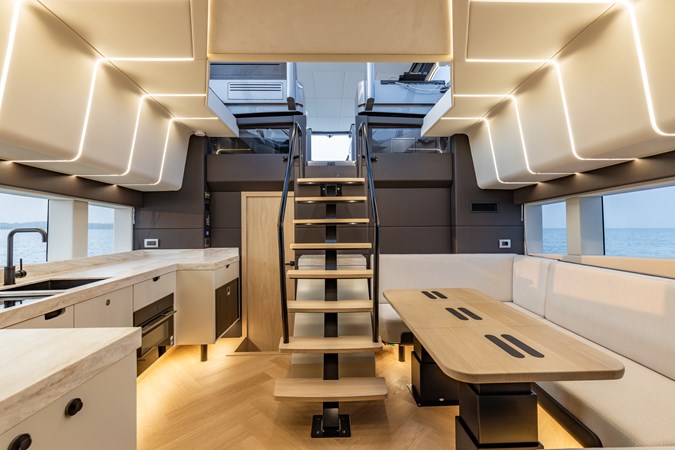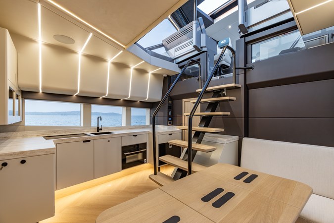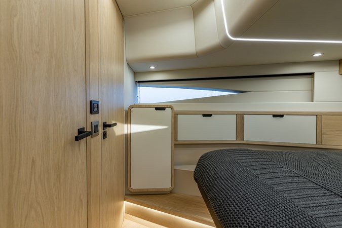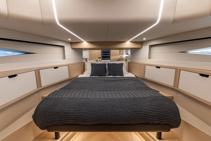 Voluminous Interior: Despite its sporty silhouette, the cabin offers a surprising 2.4 meters (8 ft) of headroom , accommodating 8 guests for day trips and providing overnight luxury in two spacious cabins.