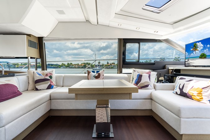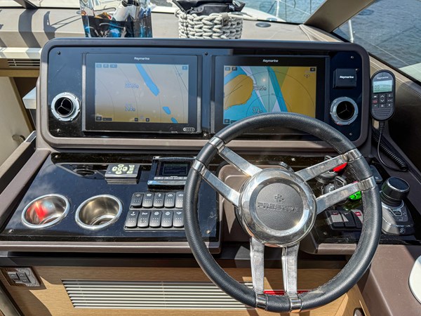 Turn heads with this rare and highly sought-after 2019 Prestige 590S, a stunning sporty flybridge yacht that masterfully blends the sleek styling of a coupe with the practicality and openness of a flybridge. Unlike typical models in the S-Line, this vessel is uniquely equipped with both a flybridge and an electric retractable sunroof, delivering the best of both worlds—open-air freedom and elevated cruising visibility.