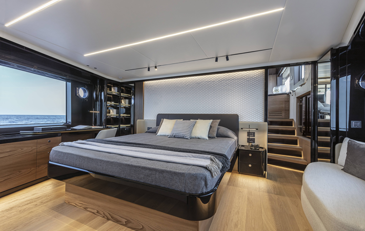 Aboard the Navetta 64, all spaces are designed to offer the maximum enjoyment of each cabin —always panoramic and bright, thanks to unprecedented-sized windows. In addition, the spaces are furnished and refined with everything you need to feel just like at home, without any sacrifices.