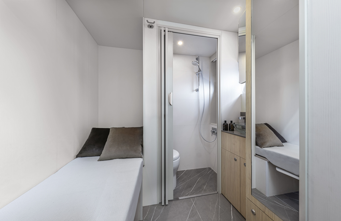 Beach Club by day and VIP cabin with an en-suite head by night: this alchemy is made possible thanks to the placing of the crew cabin—with 2 berths—directly accessible from the second starboard-side door.