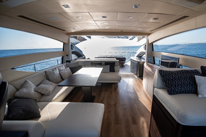 The retractable hardtop opens to the sky, allowing ownersand guests to enjoy the open-air experience that defines thePershing lifestyle.Beneath its sculpted exterior lies serious performancecapability. Powered by twin MAN V12 diesel engines producing 1,550 horsepower with only 1450 hours each andpaired with Arneson Surface Drives, this Pershing 64 can achieve speeds of up to 45 knots. Few yachts of this size canmatch its acceleration, agility, and stability at sea. Even at cruising speeds around 36–38 knots, handling remainsprecise and composed, giving the captain a sports-car-likesense of control.