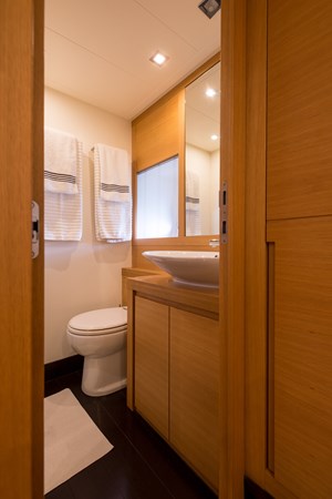 The intelligent layout accommodates three en-suite cabins — a full-beam master suite amidships with panoramic windows, a forward VIP cabin, and a twin guest cabin — each offering comfort and privacy for extended cruising