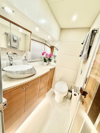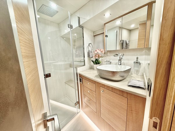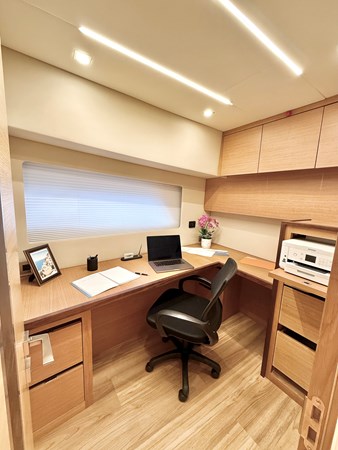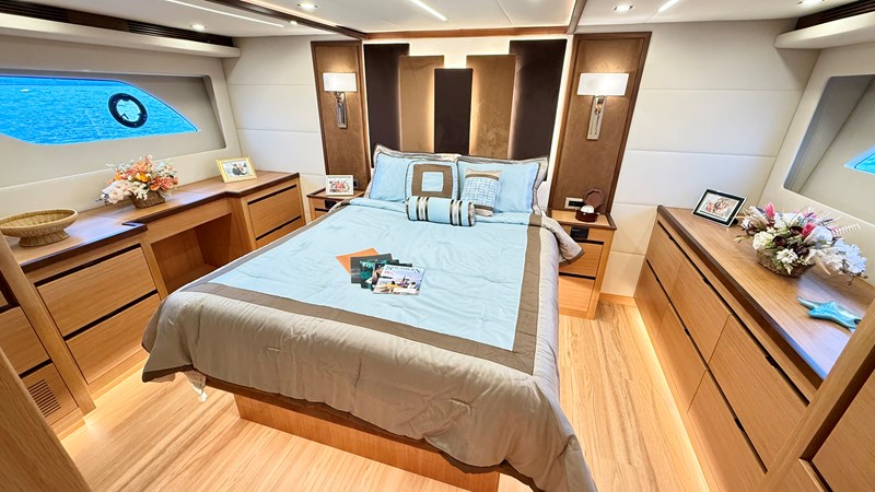 The thoughtfully designed layout features a full-beam master cabin, a forward VIP cabin, and a third cabin configured as an office, each with its own ensuite.