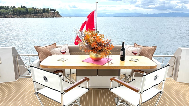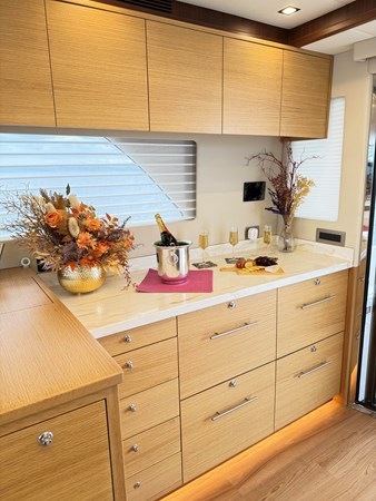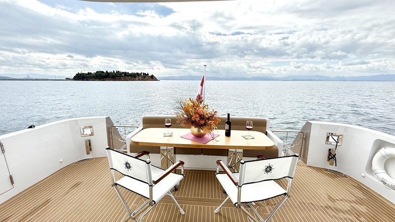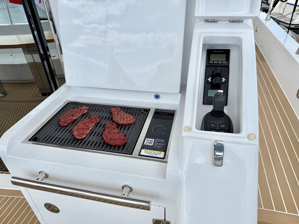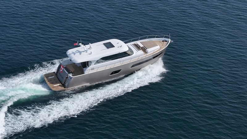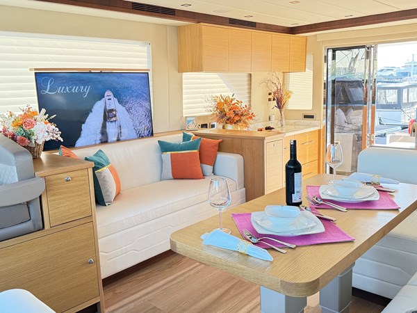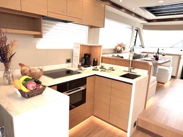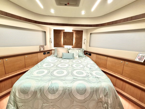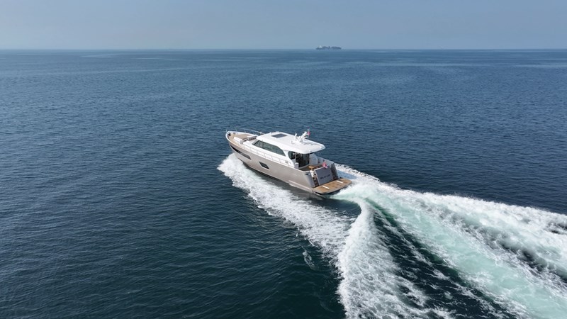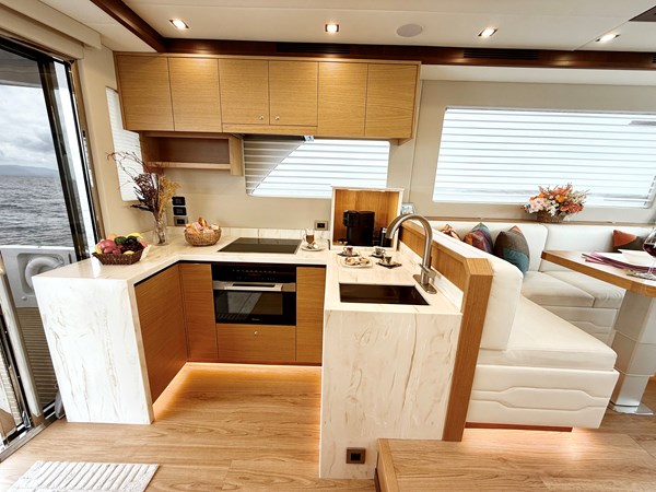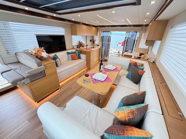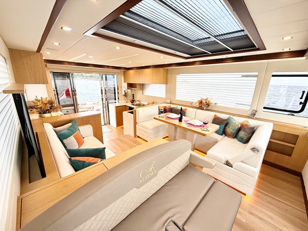 On the main deck, enjoy an elevated helm station with unobstructed views, high ceilings, an open aft galley, spacious aft deck, and a comfortable foredeck lounge.