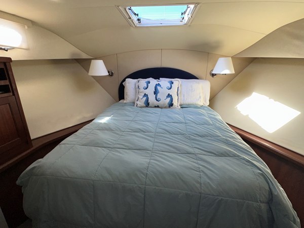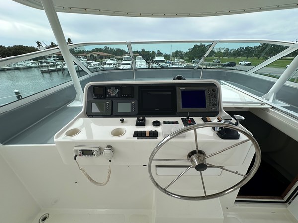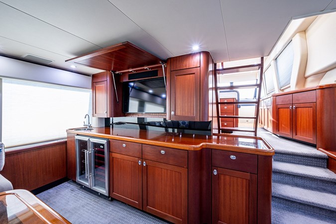 The Pacific Mariner 65’s broad windows invite the horizon into a spacious pilot house where full instrumentation and a complete electronics package reside in easy view. Sliding doors open to port and starboard decks, and teak stairs ascend to the flybridge. The intelligently equipped galley features full-sized appliances that include a side-by-side refrigerator, dishwasher, microwave, range with oven, trash compactor, and disposal. In the master suite, a king-size walkaround bed is covered in designer linens. The guest stateroom offers twin berths and its own TV, VCR and stereo with CD player. Creature comforts in each of the staterooms include cedar-lined, lighted, hanging lockers, individual room temperature controls, reading and accent lighting, and opening portlights with screens. Reigning above it all is a soaring flybridge designed for easy entertainment alongside a fully equipped helm station.