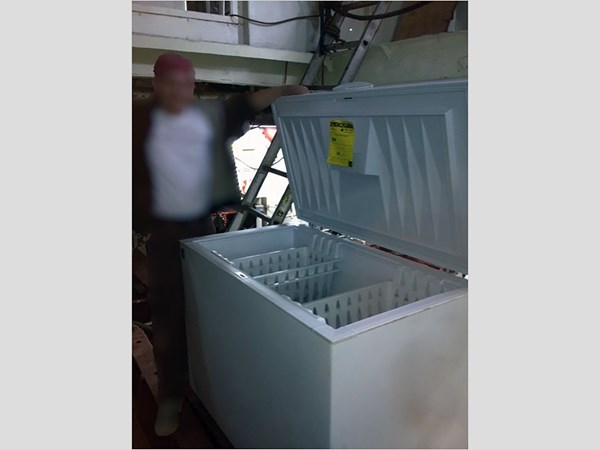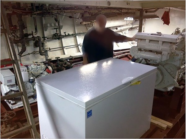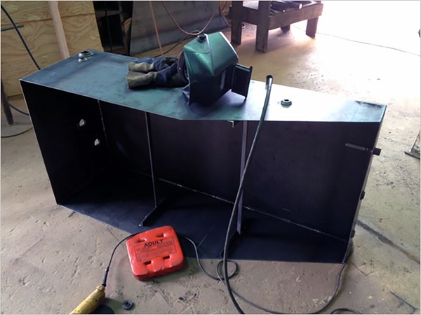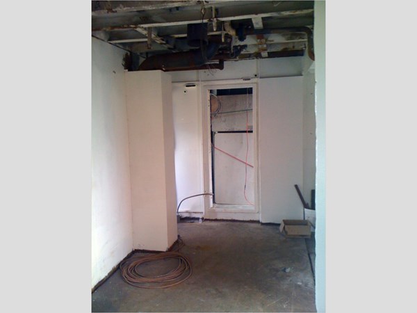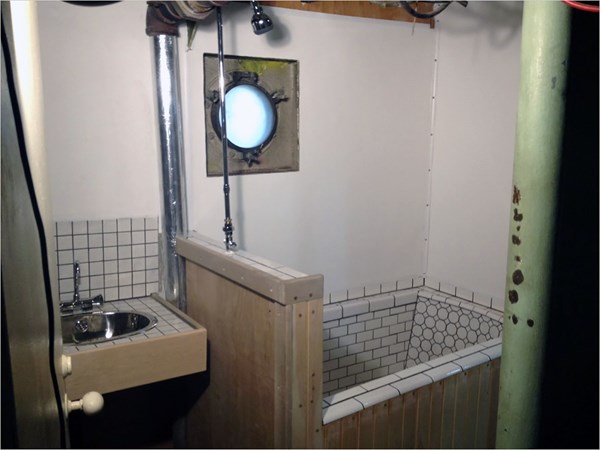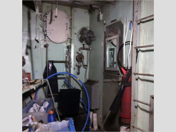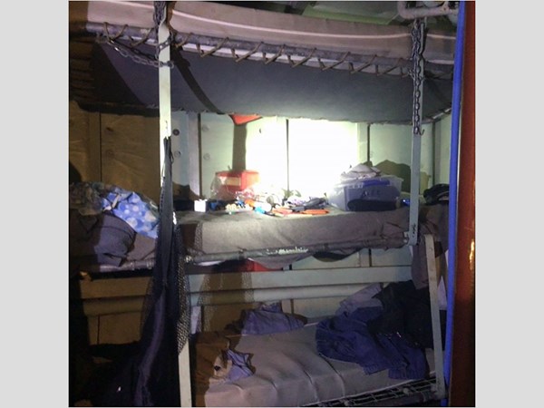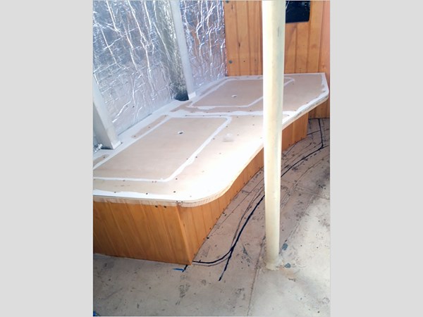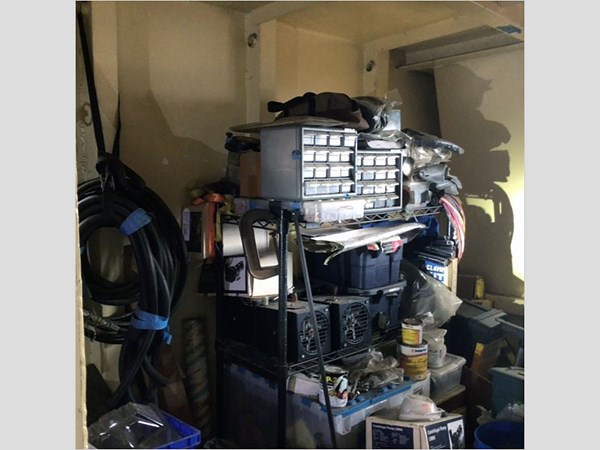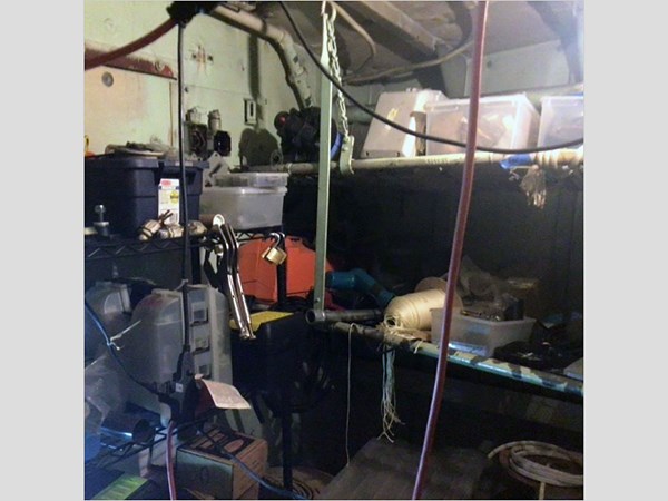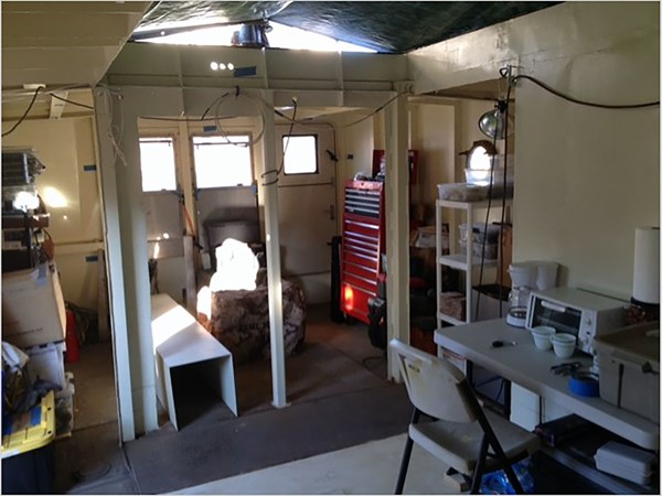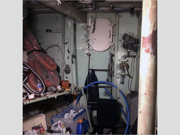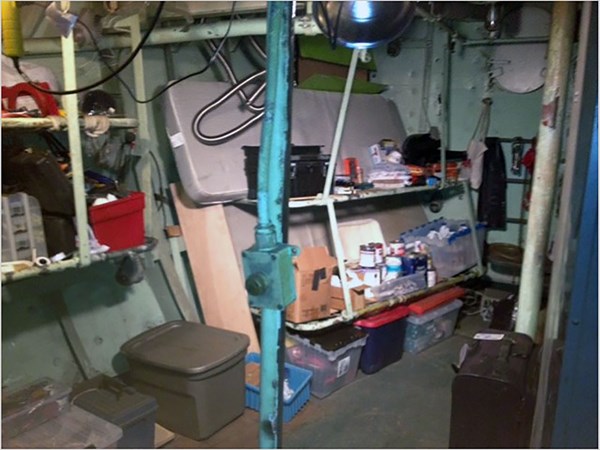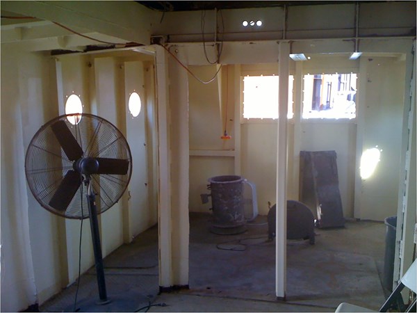 Belowdecks laid out for head forward, bench and work area, then port and starboard staterooms. This is the old crews’ quarters. It has been cleared out and ready for build.