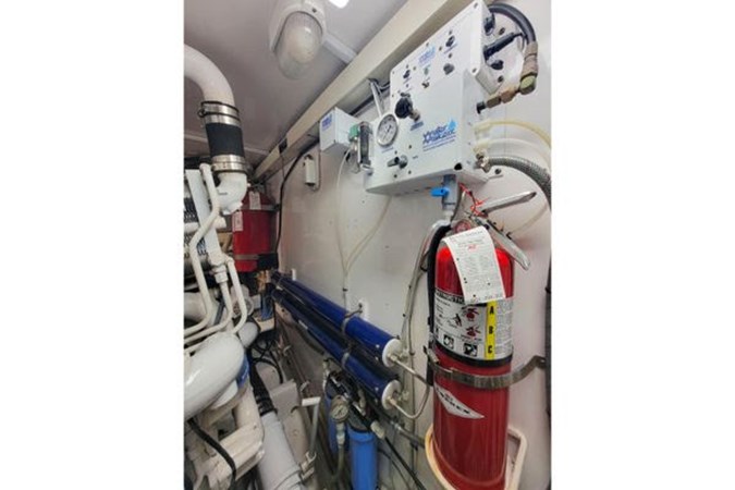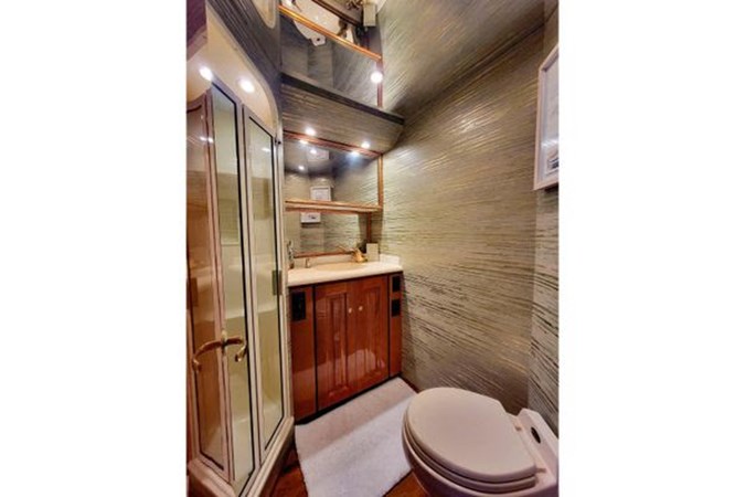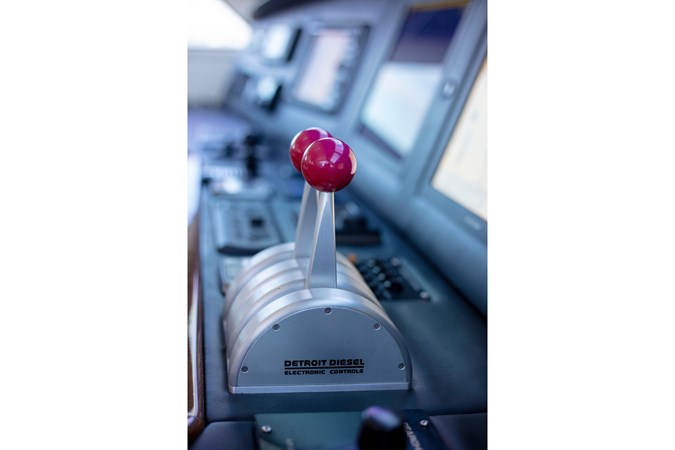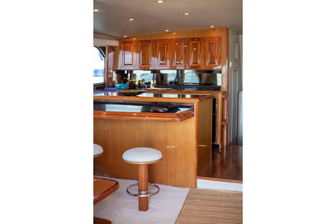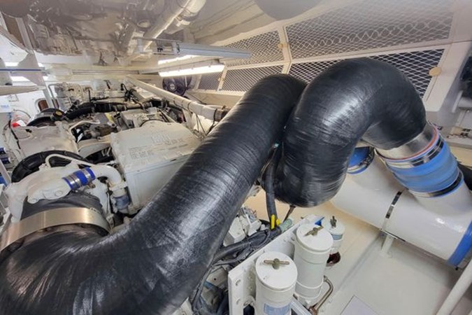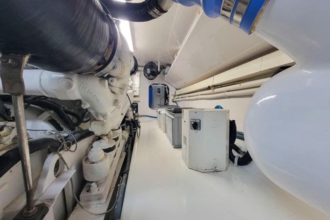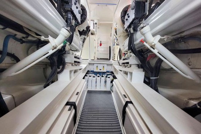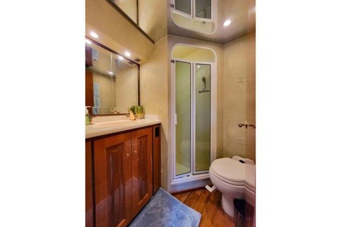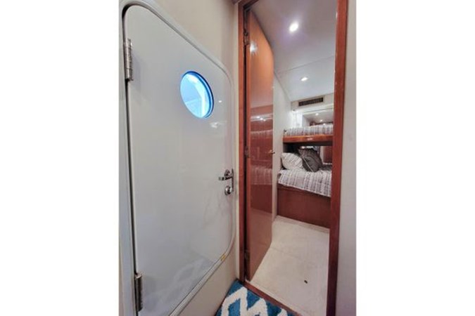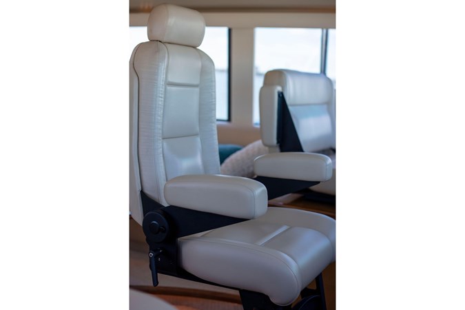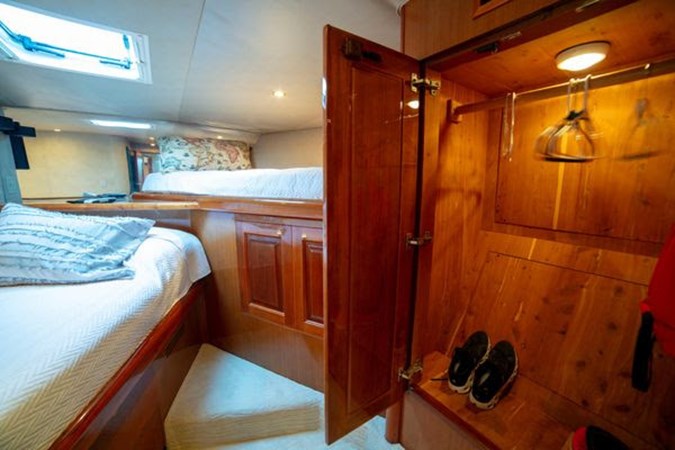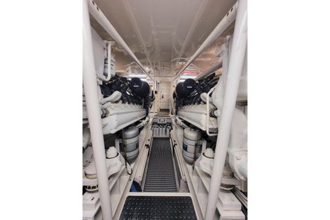 The highlight of PRIME TIME is her enclosed bridge helm and additional salon area. This allows the captain, owner, and guest to enjoy time on the water regardless of the weather conditions. PRIME TIME also features the upgraded 4 stateroom, 4 head layout. As you enter the main salon, the door is offset to Starboard to maximize interior space. The Salon features a large U-shaped sofa to Port with deep storage underneath the seating area. Great space to store tackle and gear. To Starboard is the ship’s electrical panel, entertainment area, ice machine, and spiral staircase. Forward of this is the fully equipped galley and dinette as well as a large pantry. Moving below deck, the laundry center is to Starboard, and access to crew stateroom and engine room via crew access door is to Port. The master stateroom is to Port with an ensuite head. Forward is the VIP Stateroom with an additional crossover berth and ensuite head. The additional (upgraded room) is to Starboard which features a single birth with guest head.