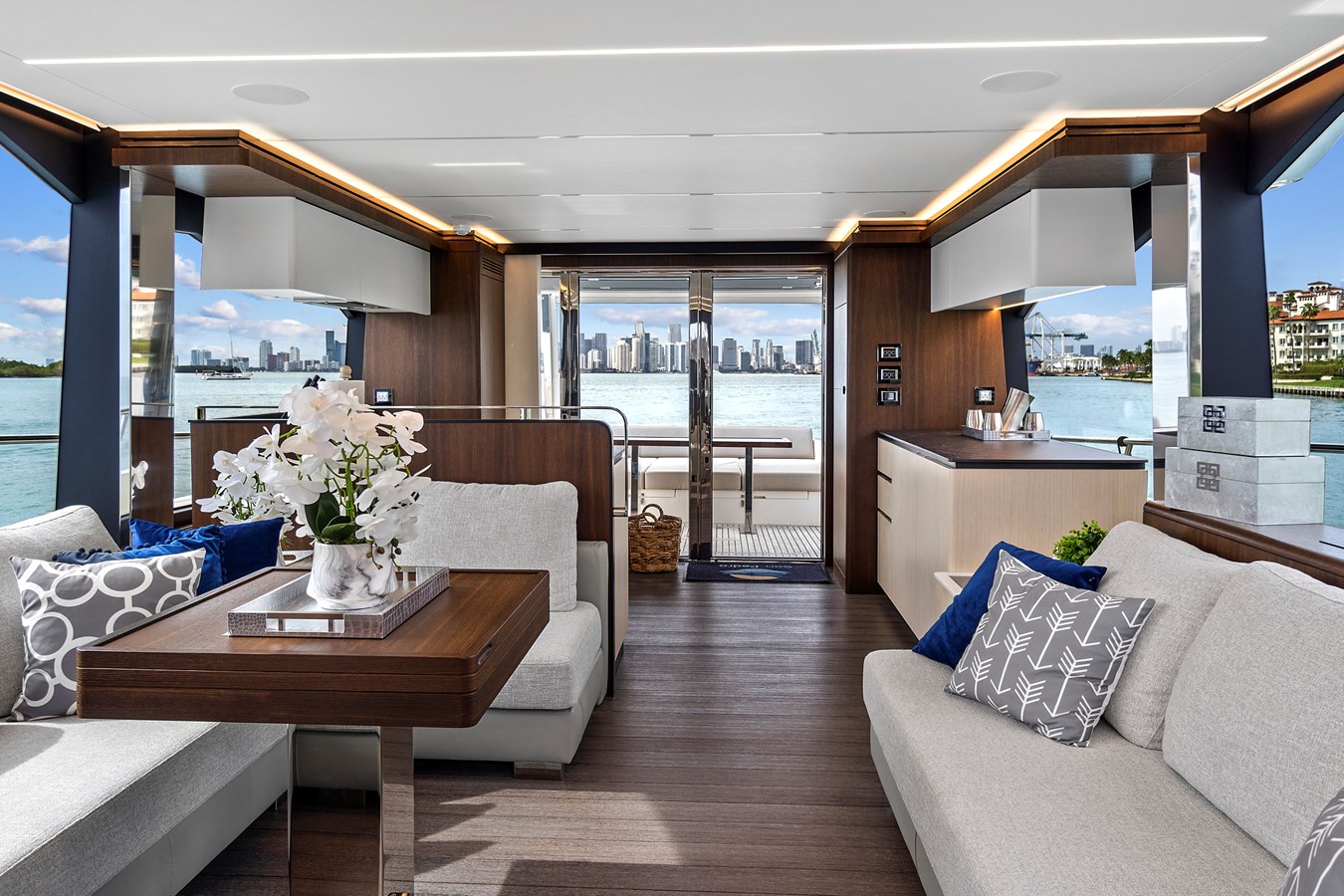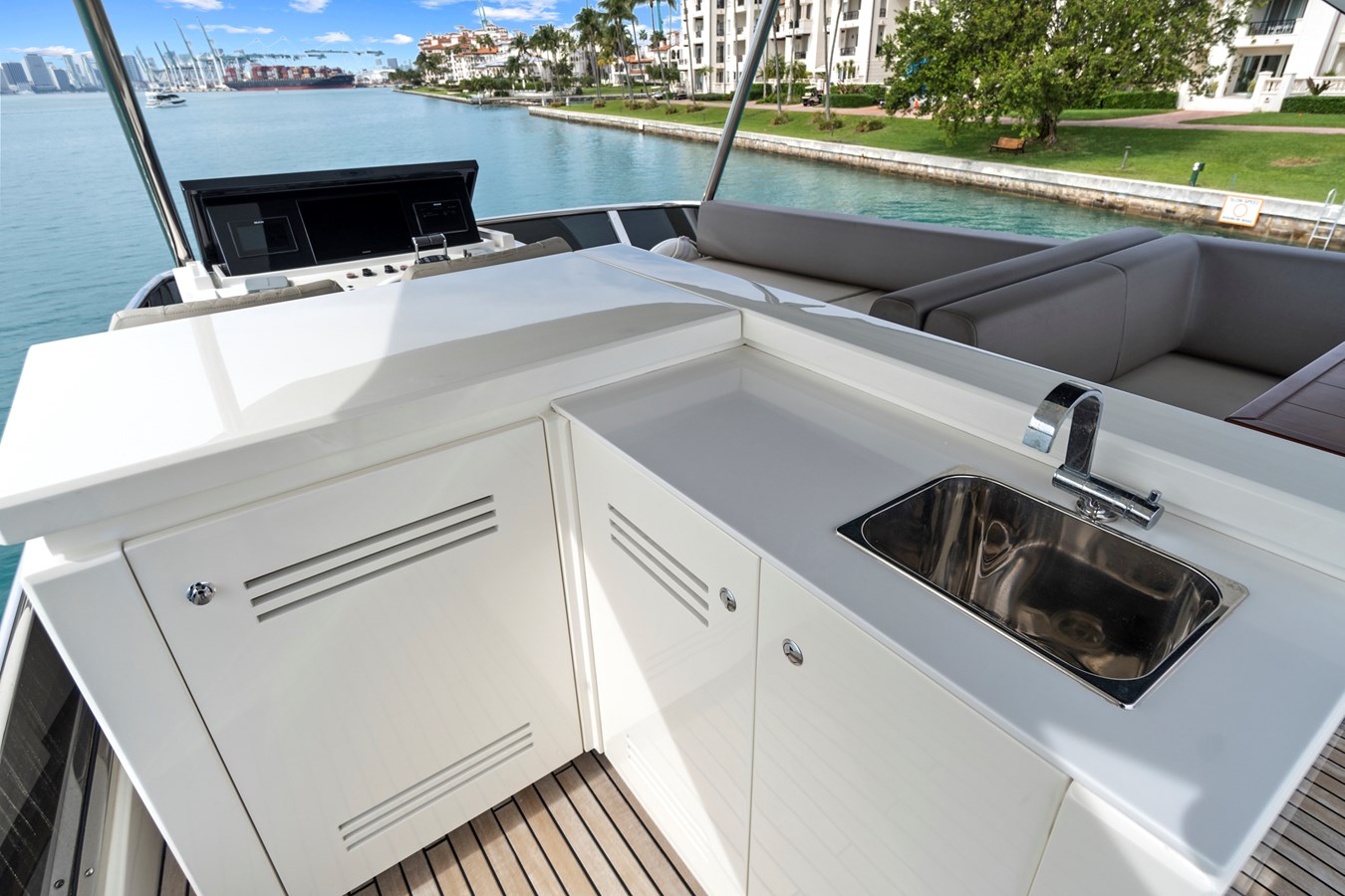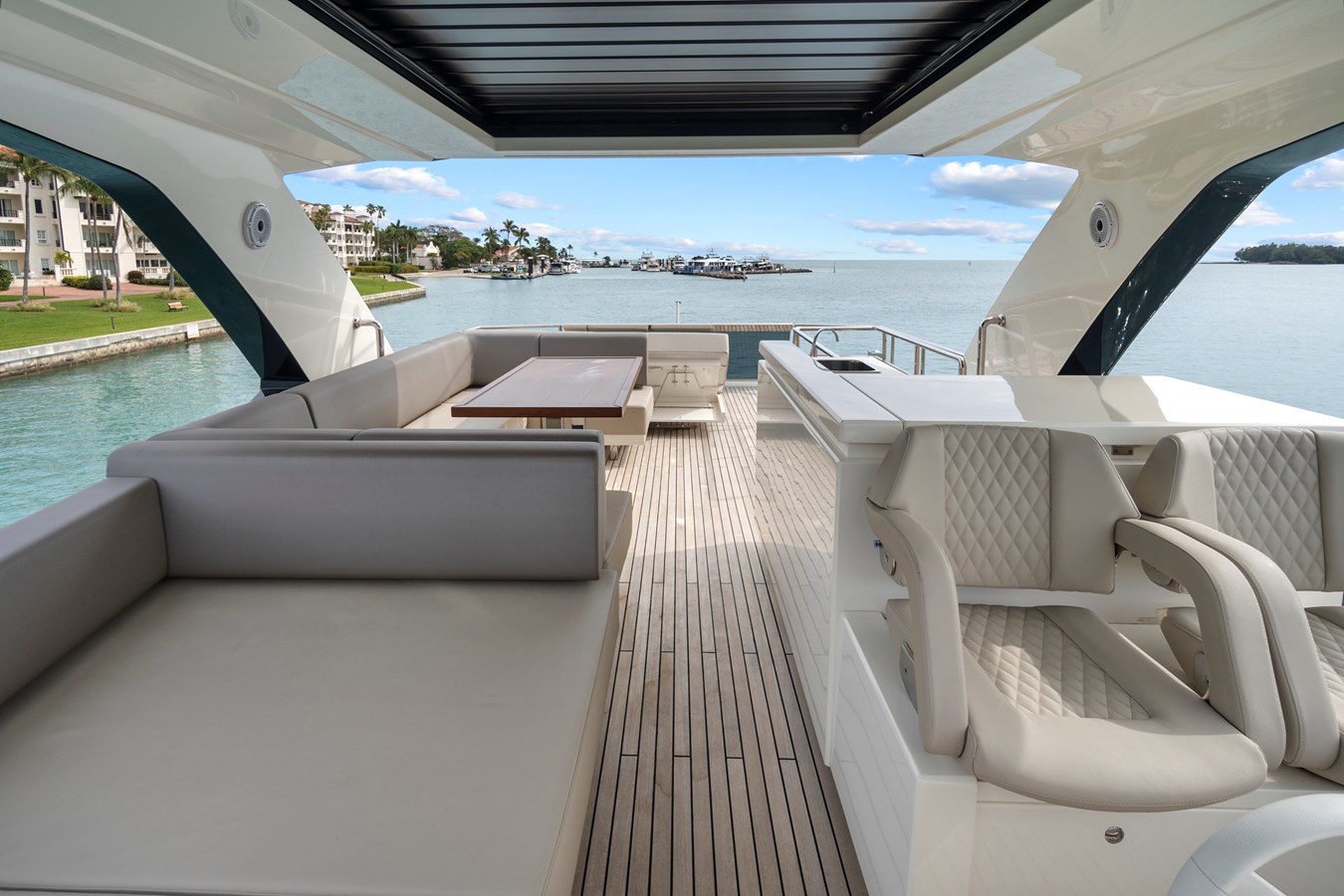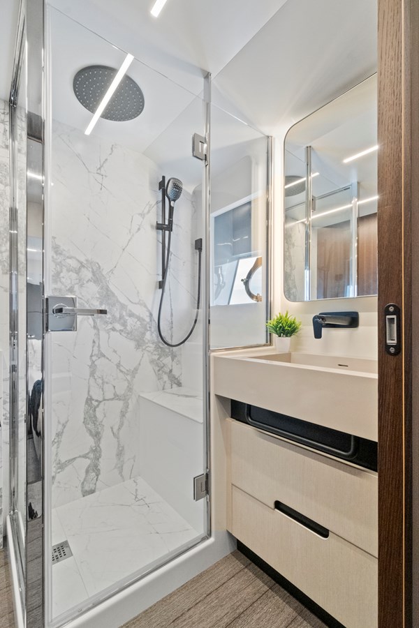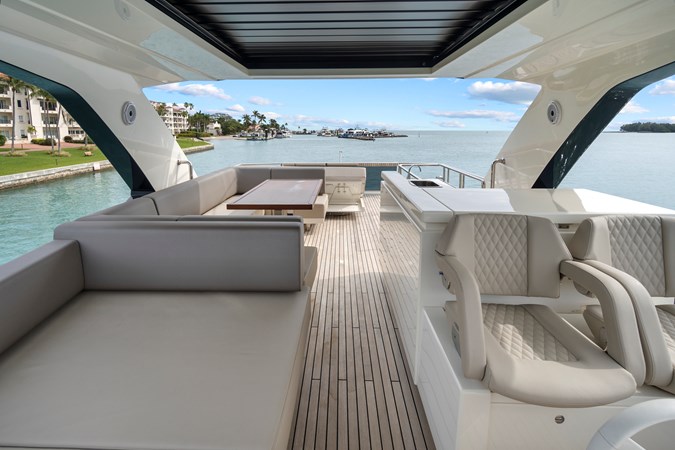 JESSEA delivers an exceptional yachting experience from the moment you step aboard. Her sleek, modern lines are matched by an impressive galley that’s perfectly suited for seamless entertaining. The flybridge is the ultimate space to relax and unwind, thoughtfully designed with comfortable seating, dining areas, a wet bar, grill, refrigerator, and all the essential amenities.