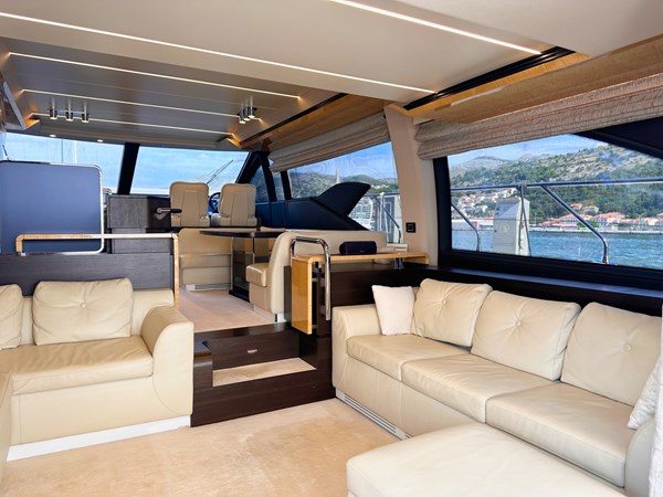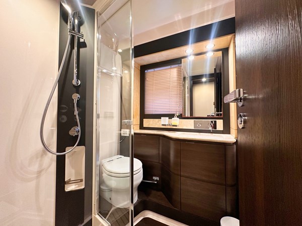 The spacious flybridge is a standout feature, offering a second helm station for easy navigation. With ample seating and a generous table for al fresco dining, this area is perfect for entertaining guests. A grill adds to the appeal, making it an ideal space to gather and enjoy the views.