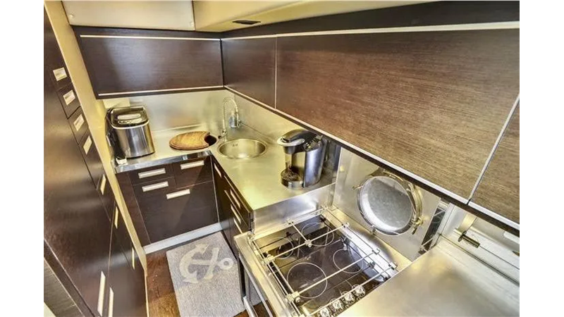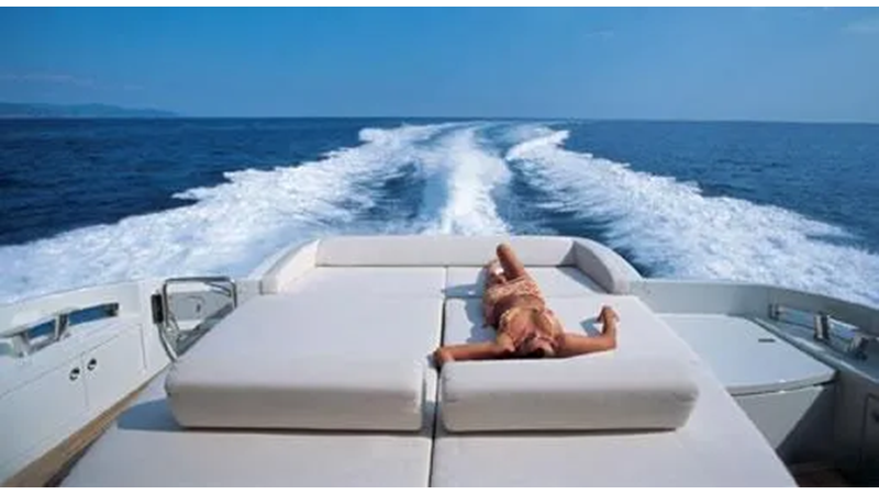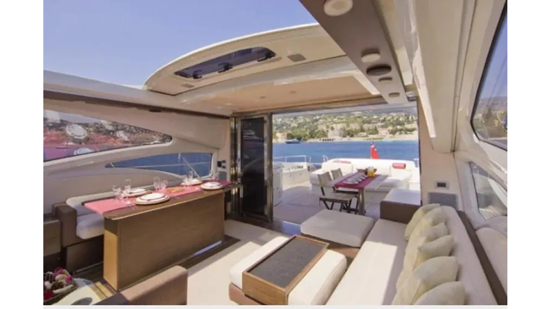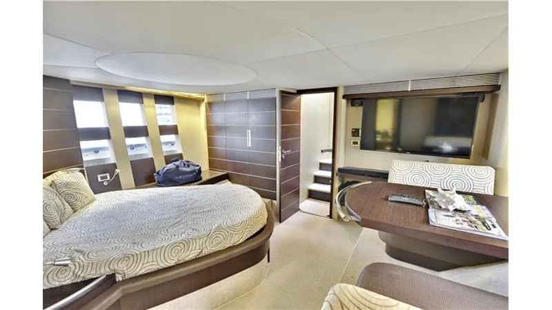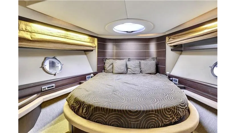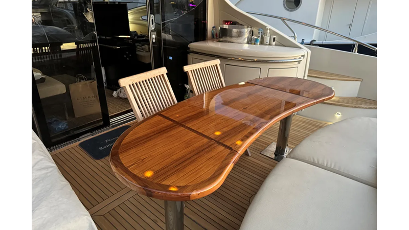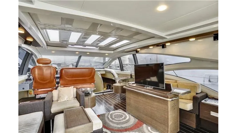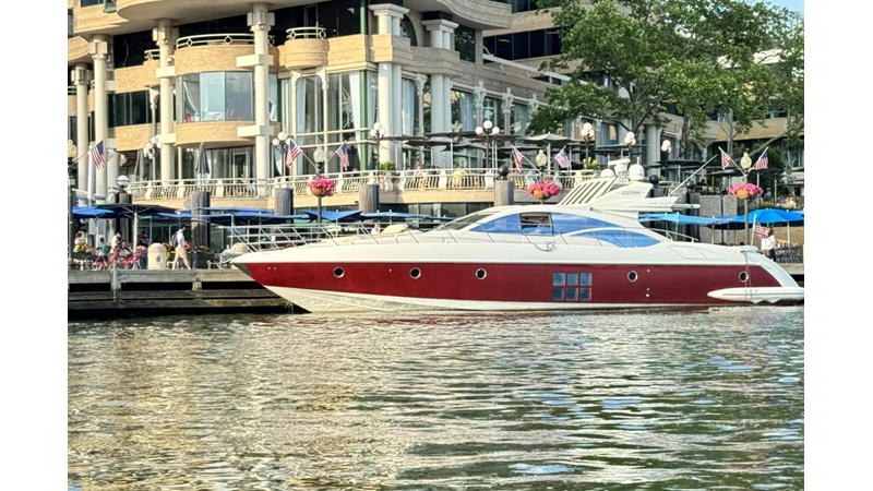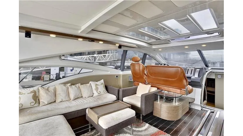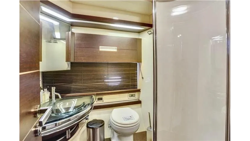Azimut pushed the styling envelope in a big way in 2005 with the introduction of the 68S. She was, as one writer called her, a “strikingly different 68-footer,” the company’s first new express in 20 years. Built on a modified-V hull with distinctive square-shaped portholes and tiered side windows, the main deck layout features a spacious, single-level salon with a deluxe entertainment center and an enormous sunroof above. There are three staterooms on the lower level including a full-beam amidships master with king bed and port lights on either side. Next forward to port is the guest cabin with twin berths and a full bathroom which doubles as a day head. The VIP is furthest forward with an island queen berth and private head and shower. There’s also a small crew cabin aft, next to the transom garage. Sliding glass doors open from the salon to the aft deck with its huge centerline sun pad, wet bar and grill. You can board from a hydraulic passerelle or from port and starboard boarding gates in the transom. The compact engineroom is accessed through an aft deck hatch. Note the teak hydraulic lift/swim platform. MTU 1,360hp V-drive diesels cruise at a fast 30 knots (33–35 knots top).