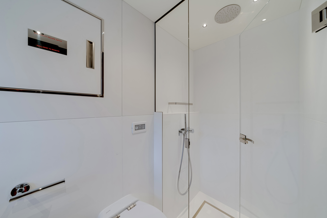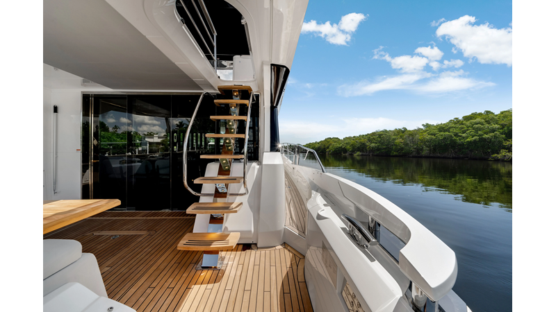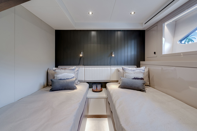 Throughout the main deck, there is a strong focus on creating generous, usable sociable spaces. The exterior lines flow effortlessly from the Portuguese-bridge bow seating and sunbathing areas to the expansive cockpit adjoining an innovative Beach Club with enhanced features, including a dedicated water level locker for two SeaBobs, delivering effortless enjoyment. Internally, the expansive main saloon benefits from sweeping glazing, extending below the TV console, revealing glimpses of the sea from all perspectives.