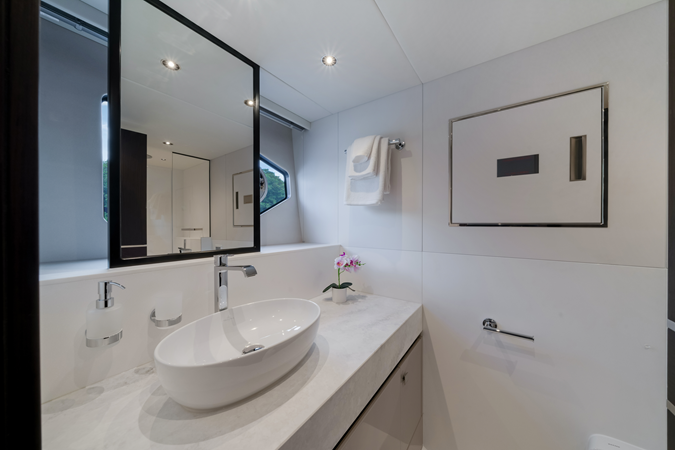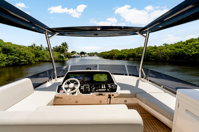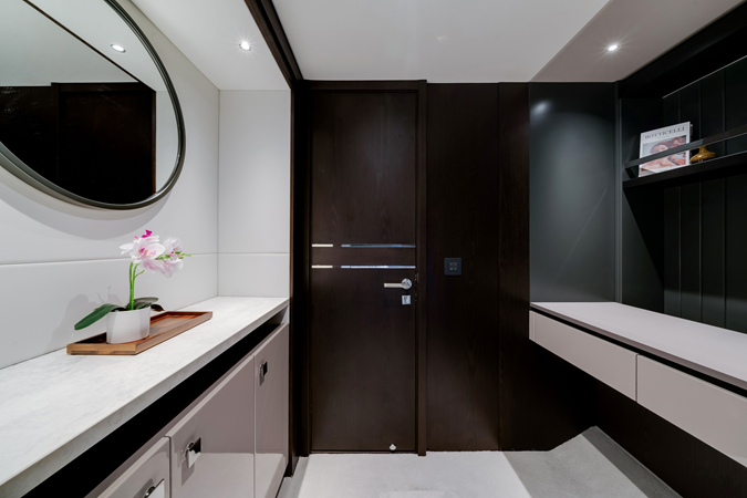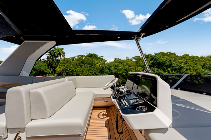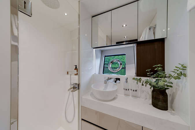 The fully-equipped aft galley with a large dinette links seamlessly to the cockpit via full-width sliding doors, helping to bring everyone together. The innovative design layout allows yachting owners to welcome guests with a strong focus on ambient lighting and interior detailing. Access to the spacious guest and master cabins is via the lower helm and elevated companion seating. The interiors boast exquisite attention to detail with a new palate of upholstery that provides a cool, crisp, and contemporary look, unmistakably a Manhattan.