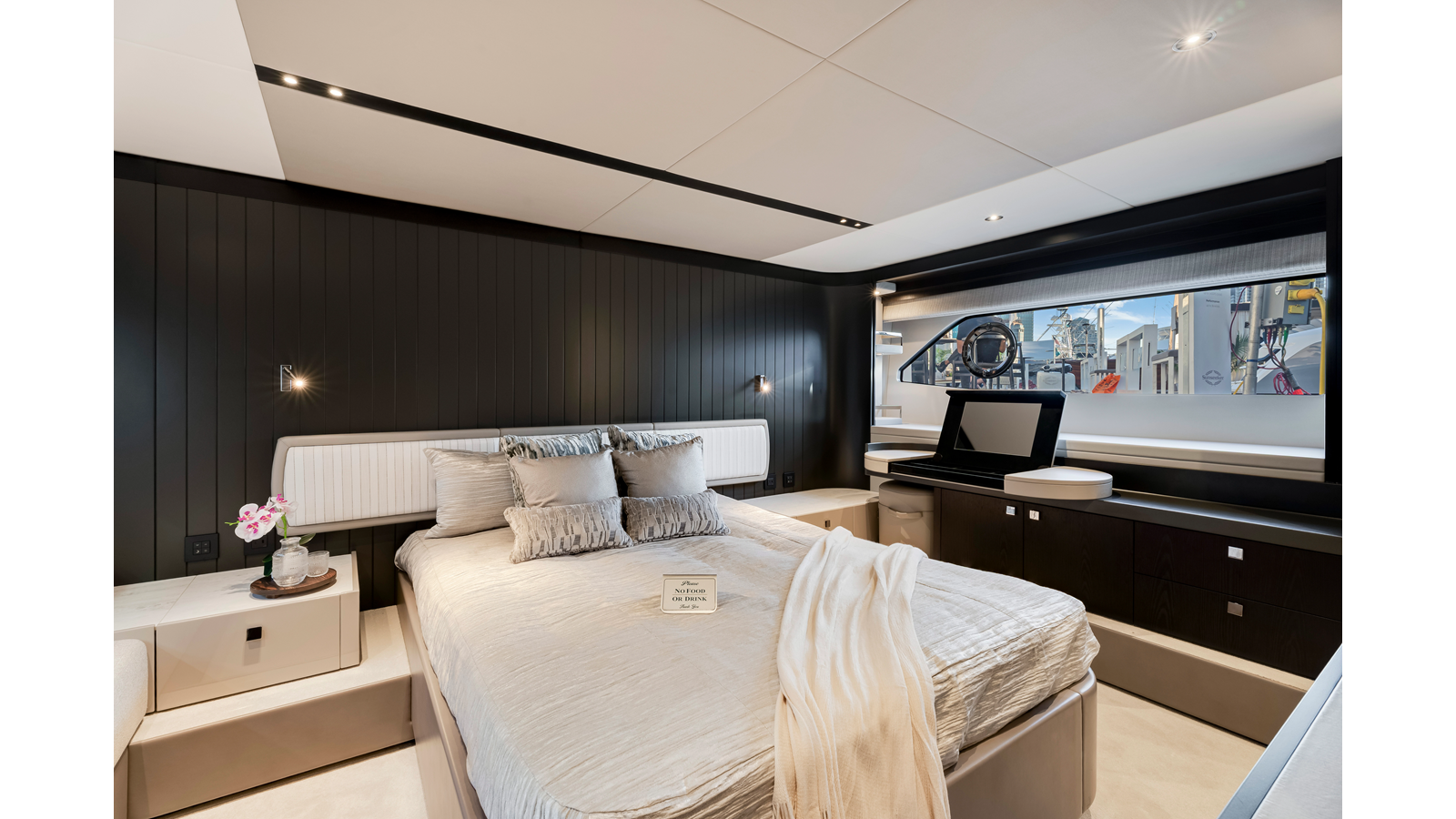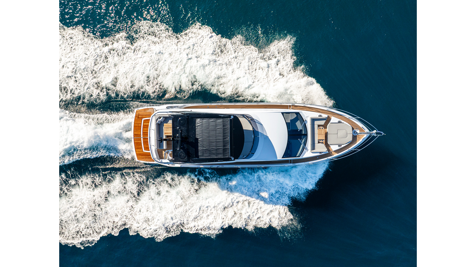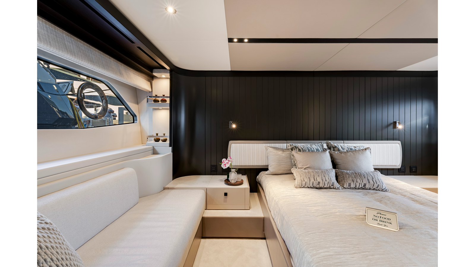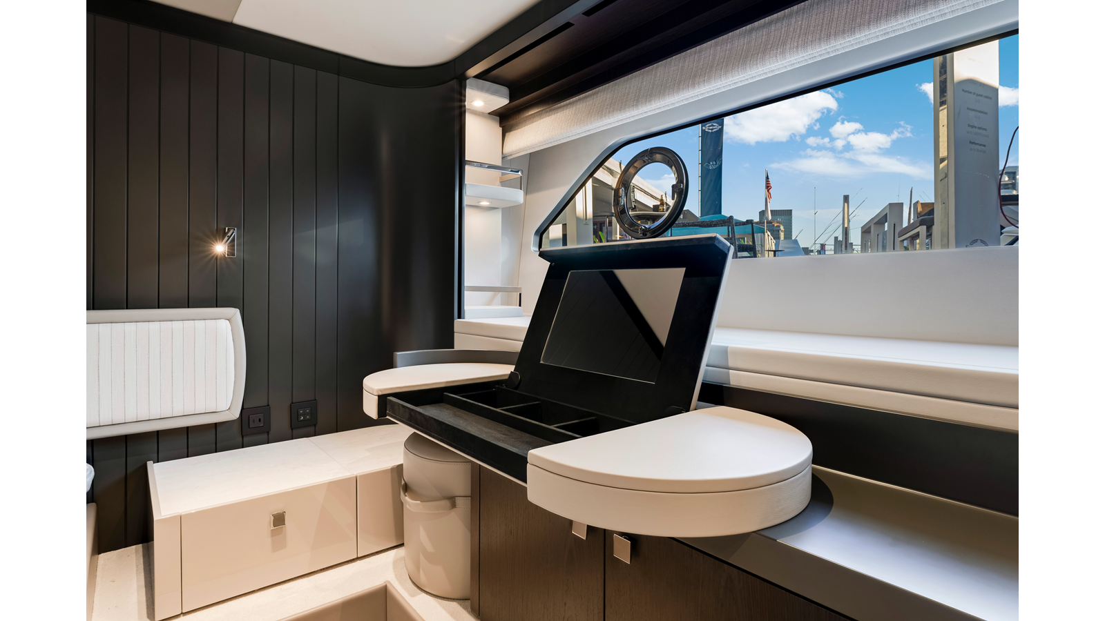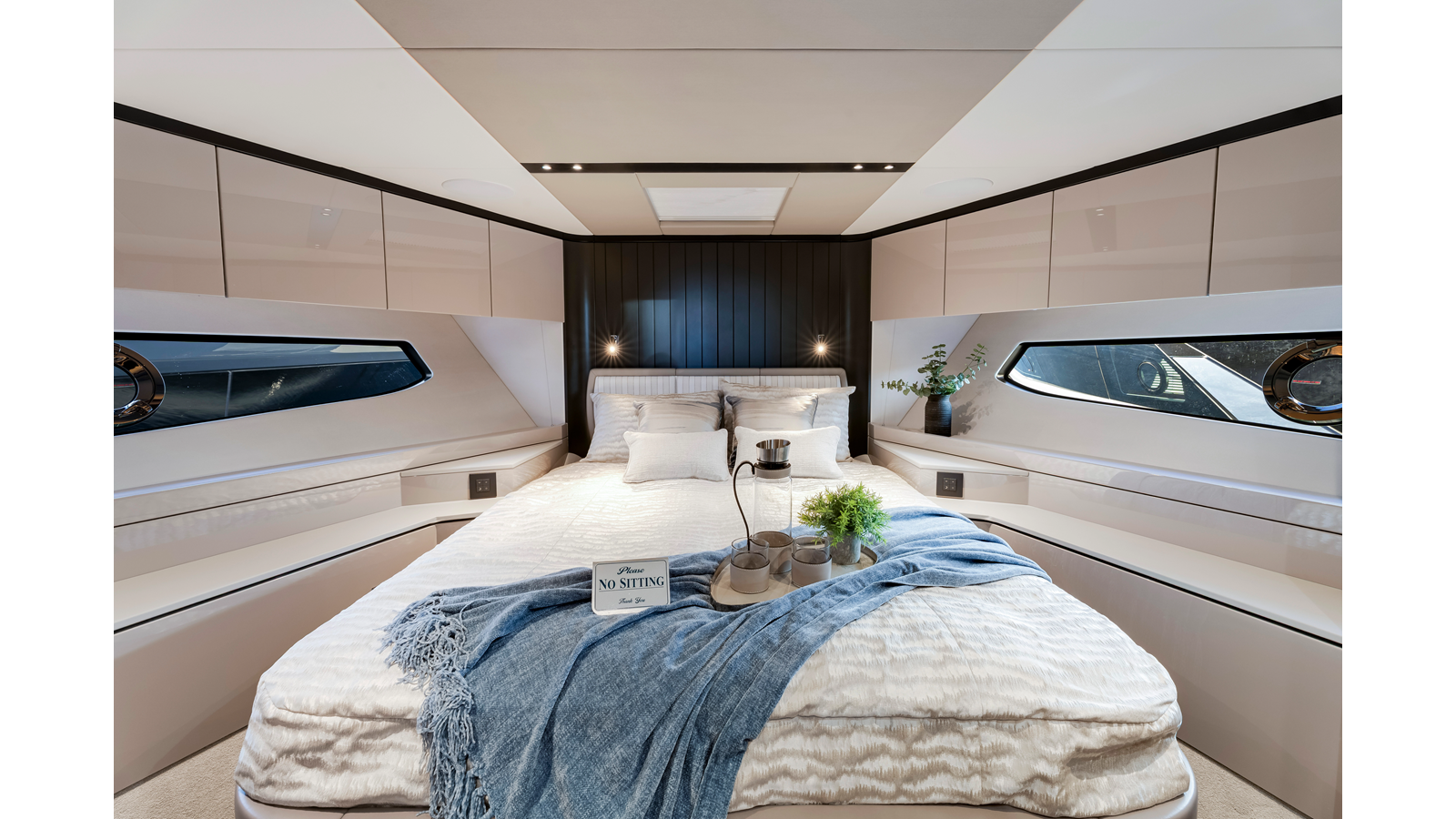 The fully-equipped aft galley with a large dinette links seamlessly to the cockpit via full-width sliding doors, helping to bring everyone together. The innovative design layout allows yachting owners to welcome guests with a strong focus on ambient lighting and interior detailing. Access to the spacious guest and master cabins is via the lower helm and elevated companion seating. The interiors boast exquisite attention to detail with a new palate of upholstery that provides a cool, crisp, and contemporary look, unmistakably a Manhattan.
