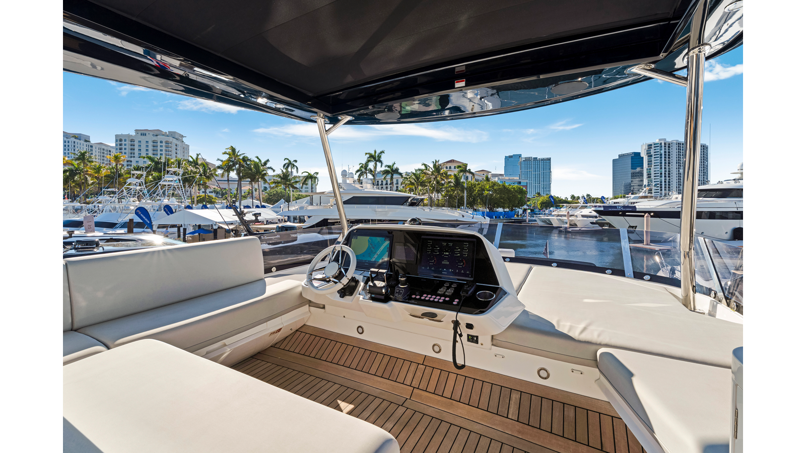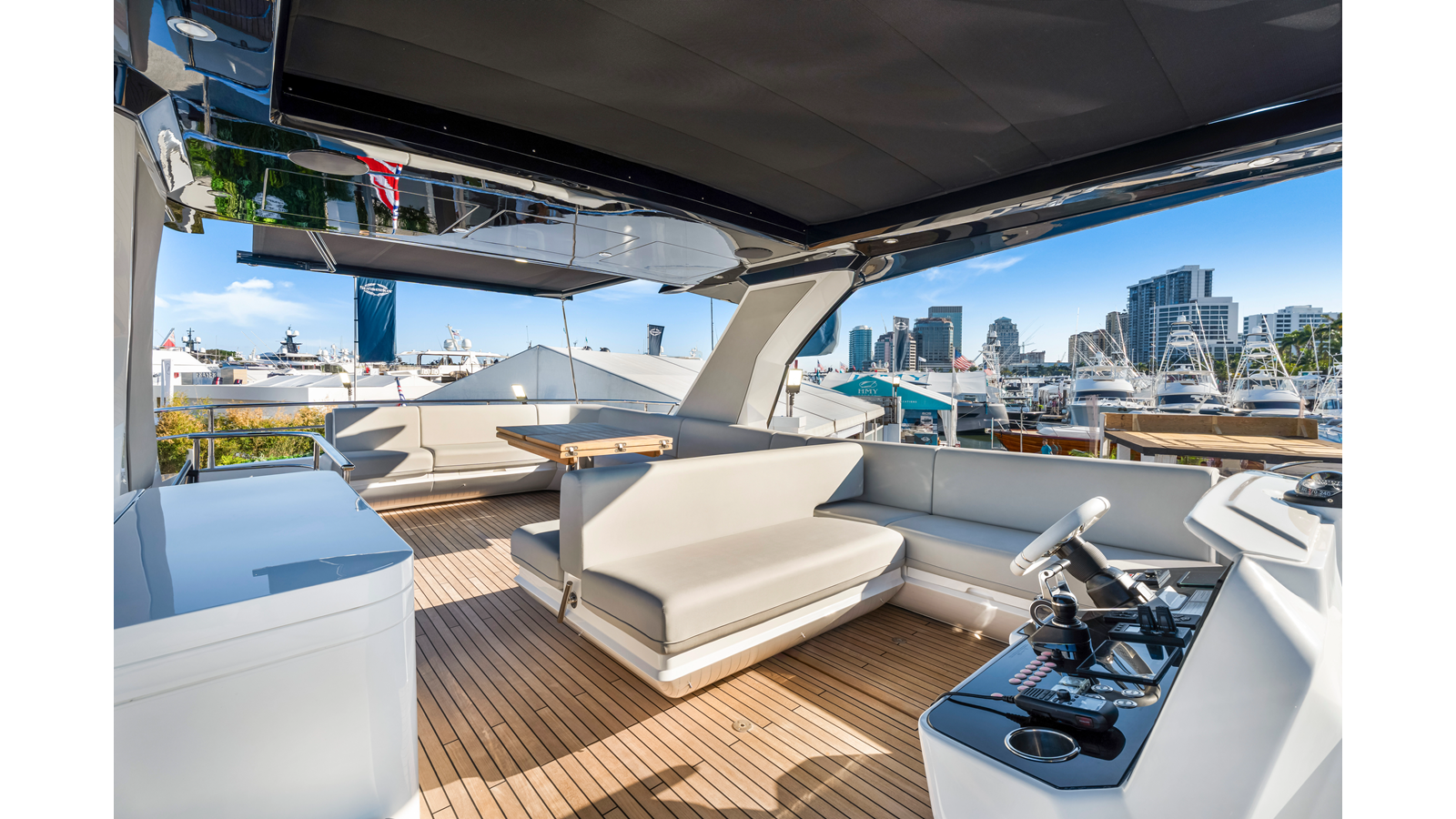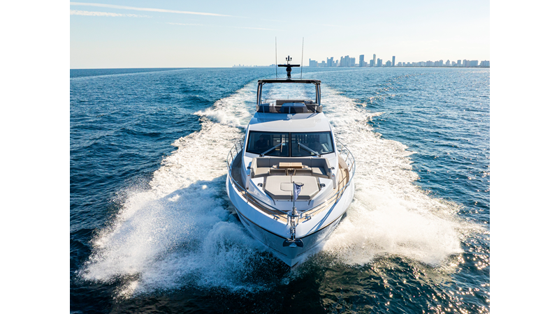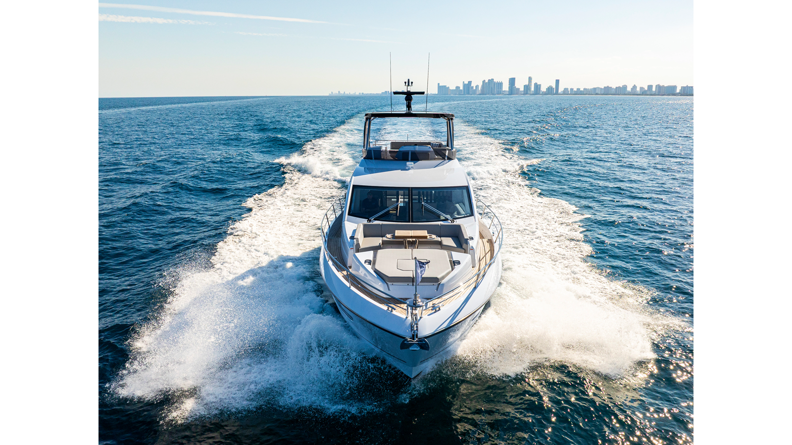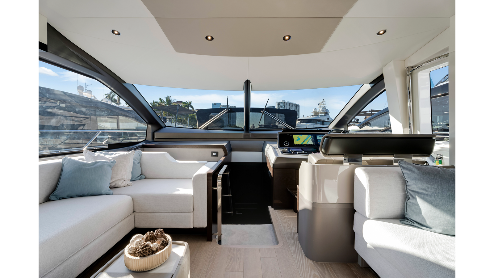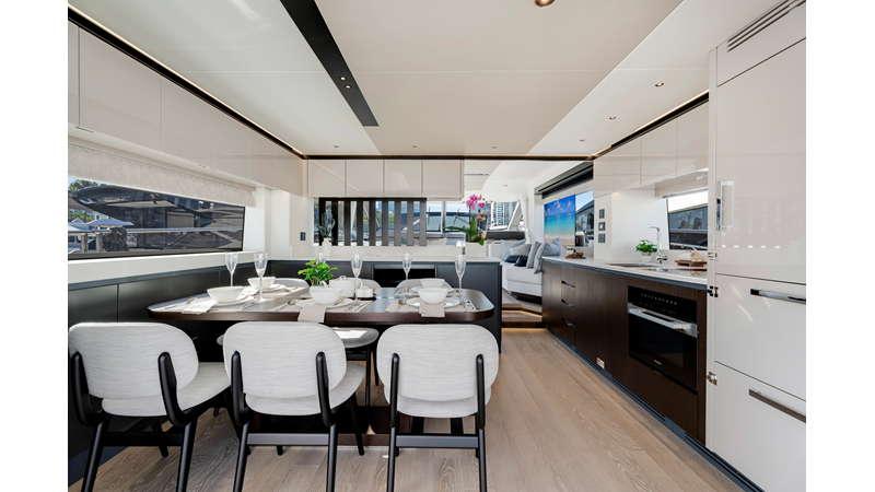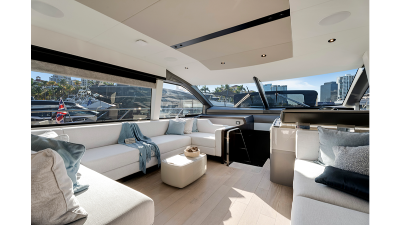 The fully-equipped aft galley with a large dinette links seamlessly to the cockpit via full-width sliding doors, helping to bring everyone together. The innovative design layout allows yachting owners to welcome guests with a strong focus on ambient lighting and interior detailing. Access to the spacious guest and master cabins is via the lower helm and elevated companion seating. The interiors boast exquisite attention to detail with a new palate of upholstery that provides a cool, crisp, and contemporary look, unmistakably a Manhattan.