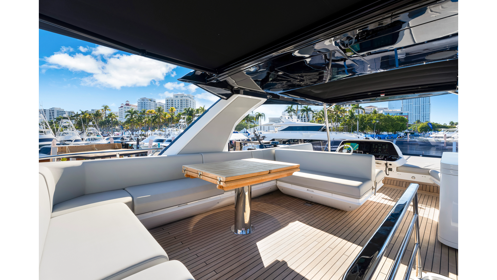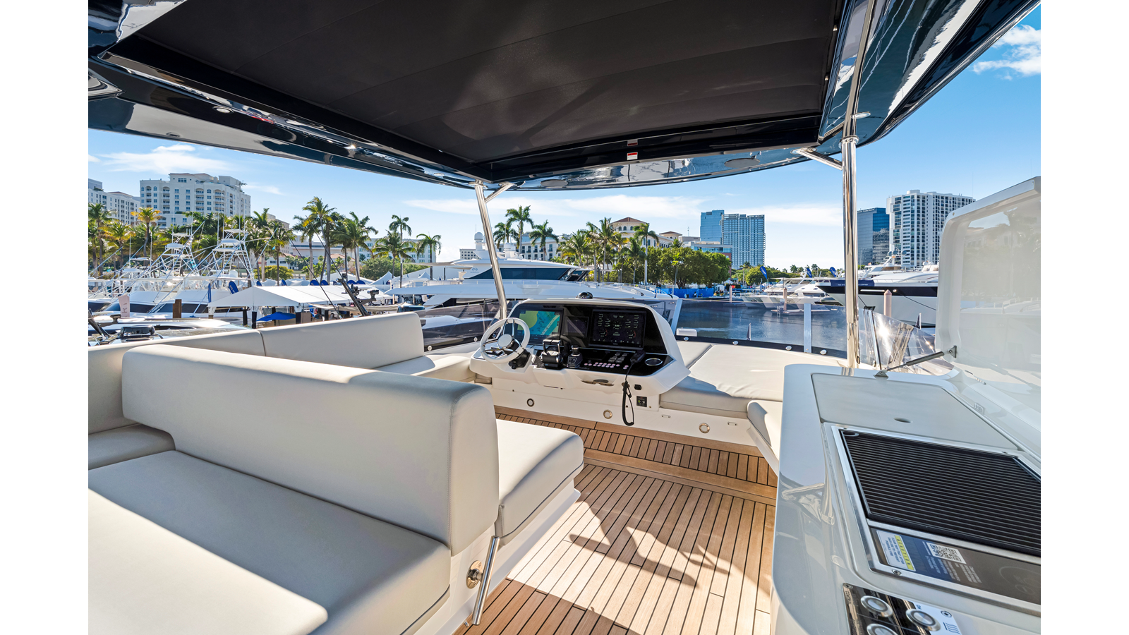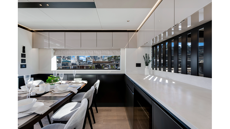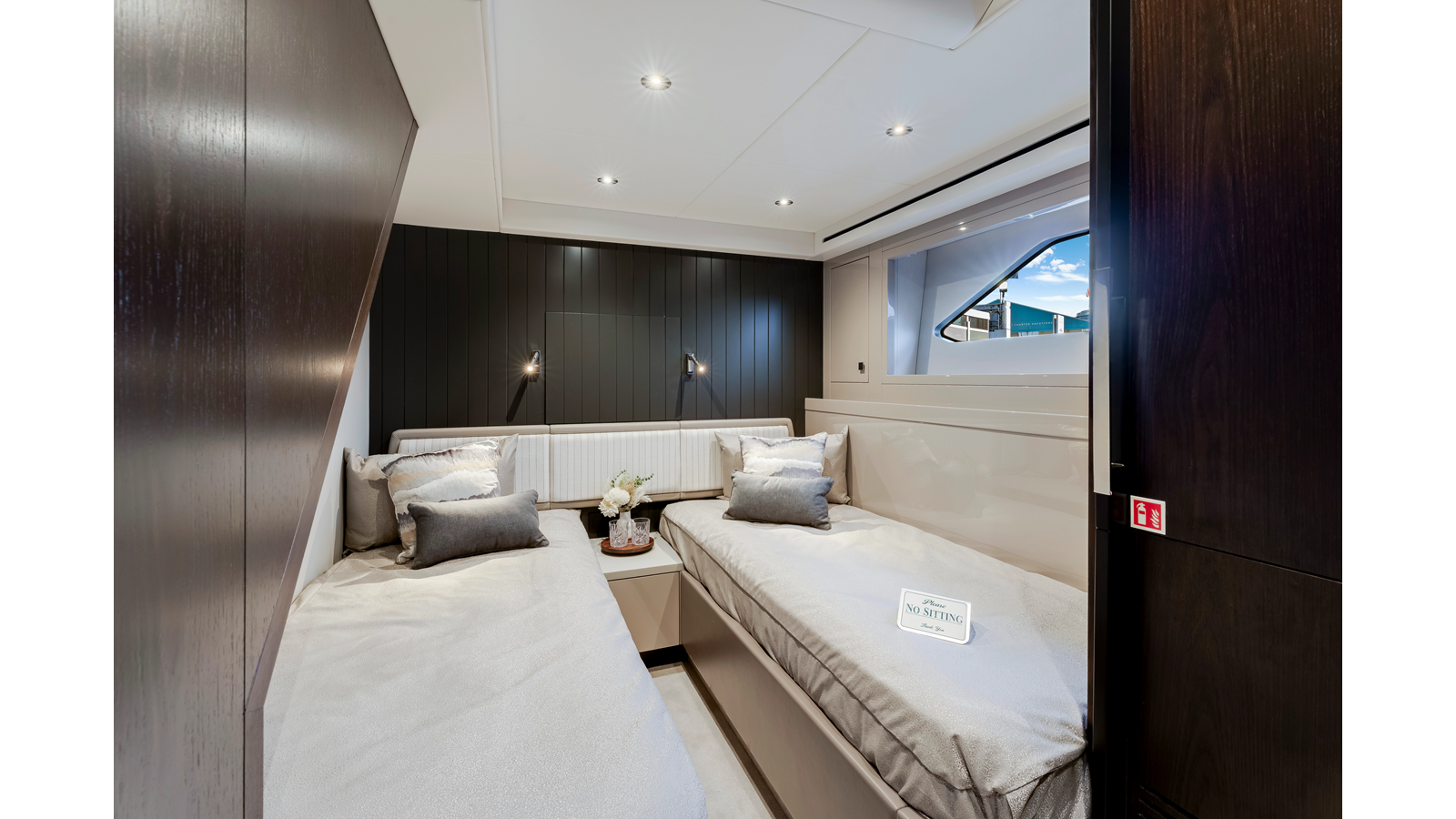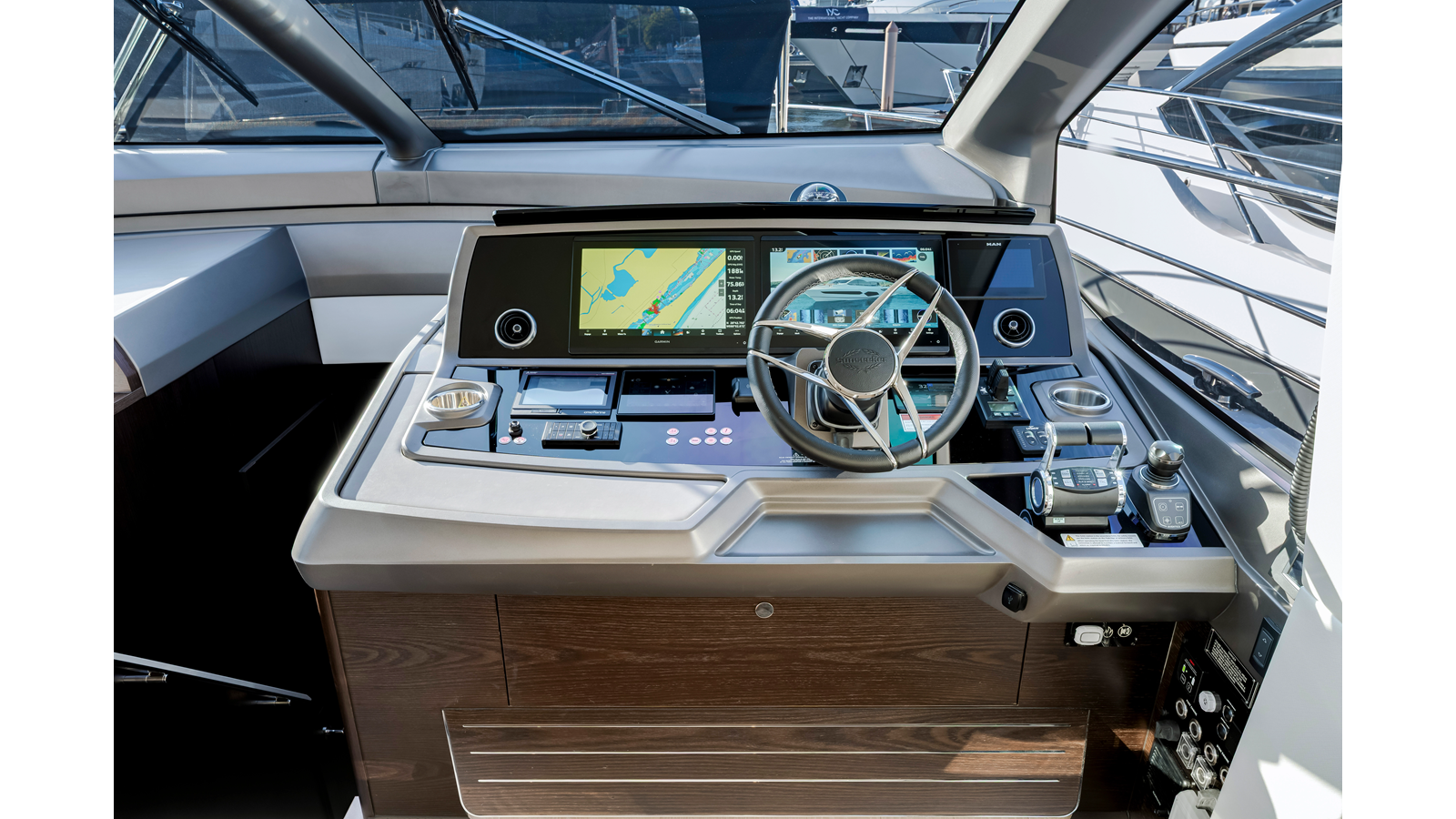 The fully-equipped aft galley with a large dinette links seamlessly to the cockpit via full-width sliding doors, helping to bring everyone together. The innovative design layout allows yachting owners to welcome guests with a strong focus on ambient lighting and interior detailing. Access to the spacious guest and master cabins is via the lower helm and elevated companion seating. The interiors boast exquisite attention to detail with a new palate of upholstery that provides a cool, crisp, and contemporary look, unmistakably a Manhattan.