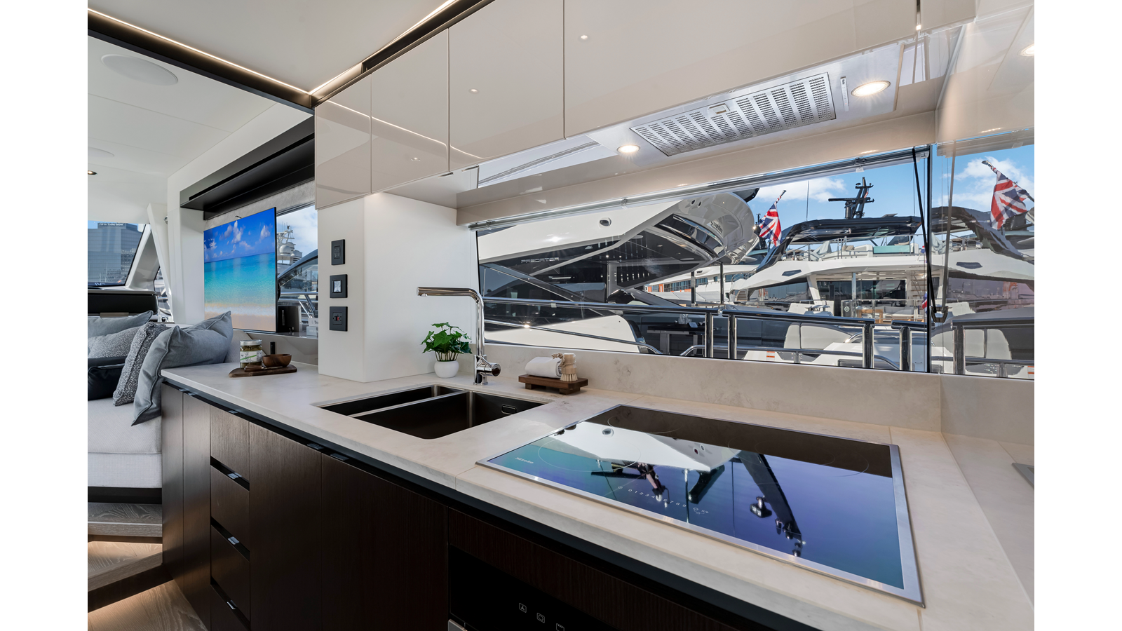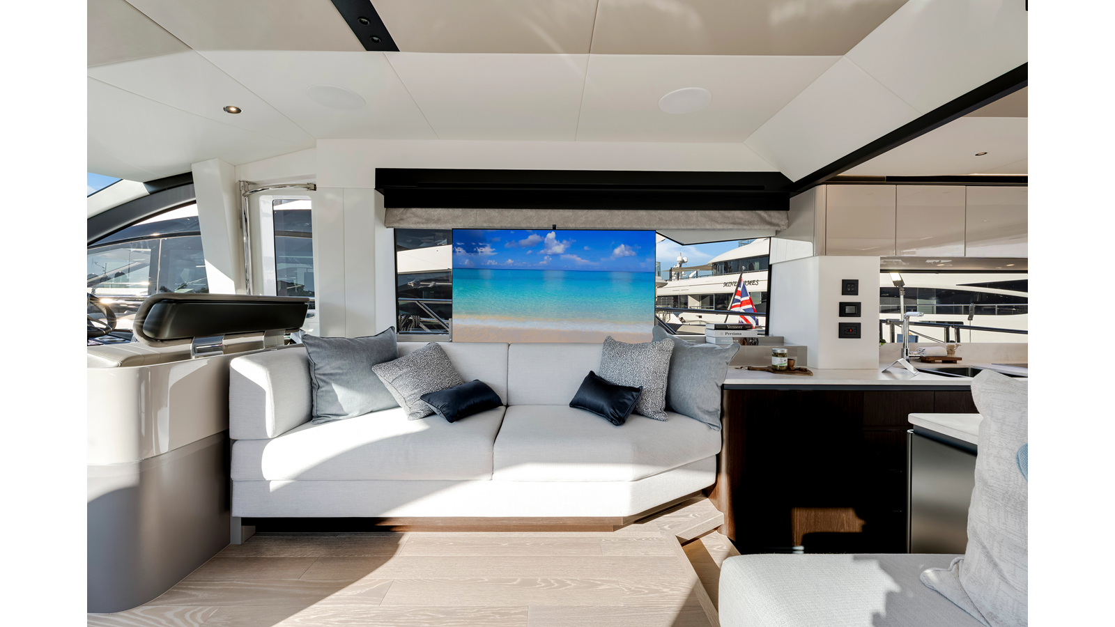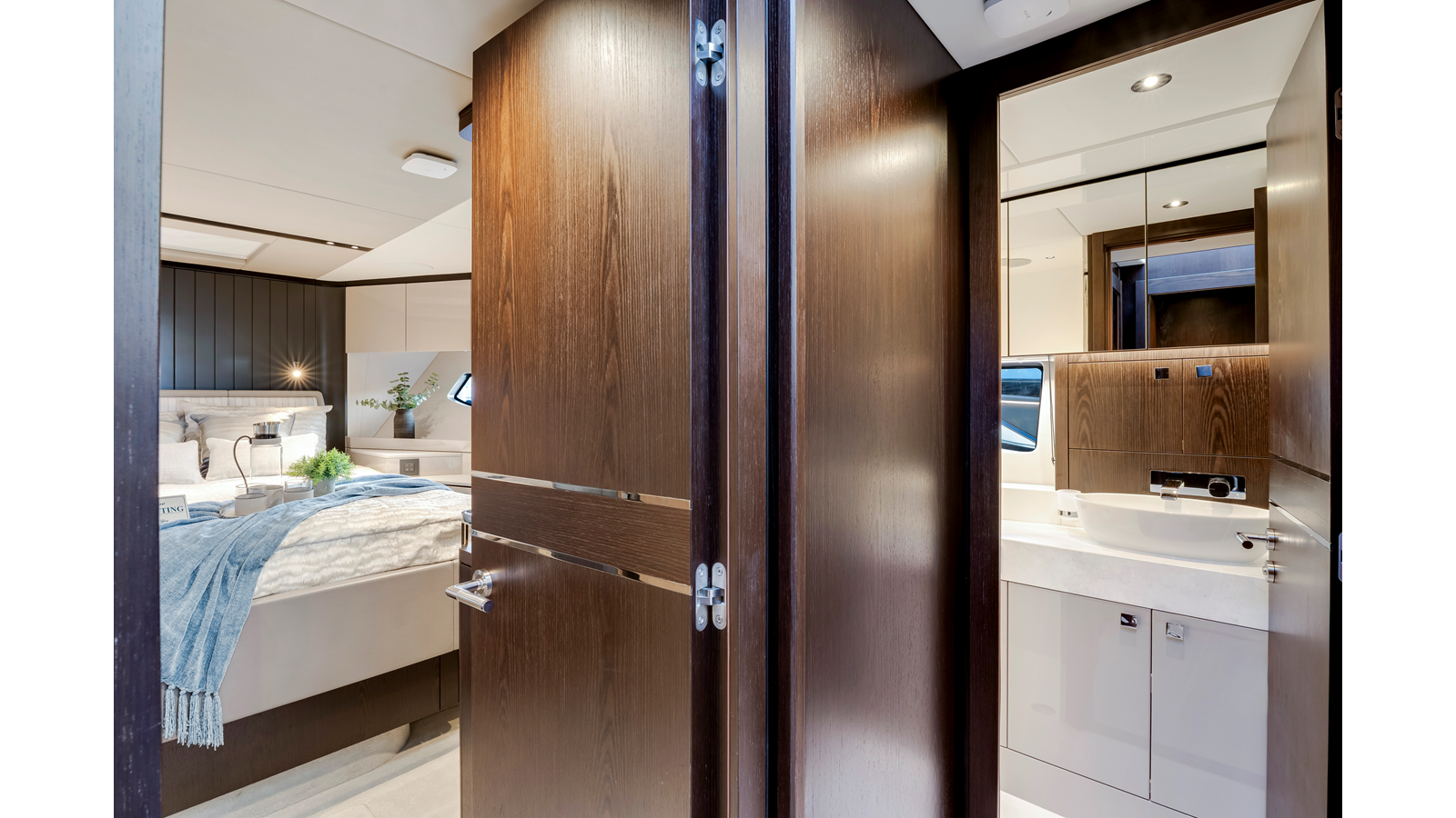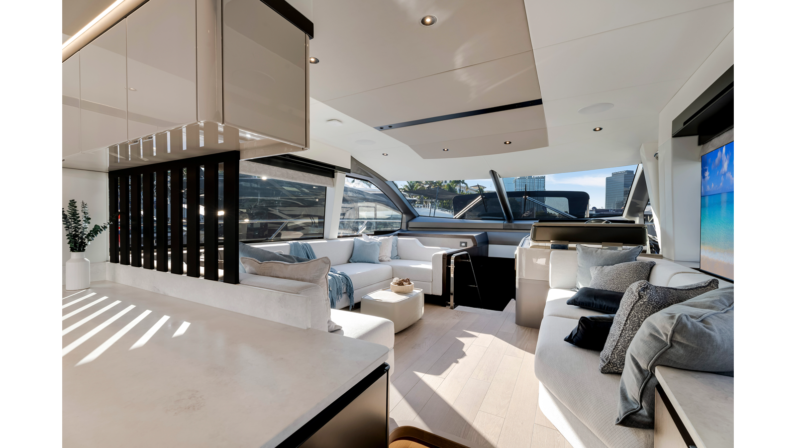 Throughout the main deck, there is a strong focus on creating generous, usable sociable spaces. The exterior lines flow effortlessly from the Portuguese-bridge bow seating and sunbathing areas to the expansive cockpit adjoining an innovative Beach Club with enhanced features, including a dedicated water level locker for two SeaBobs, delivering effortless enjoyment. Internally, the expansive main saloon benefits from sweeping glazing, extending below the TV console, revealing glimpses of the sea from all perspectives.