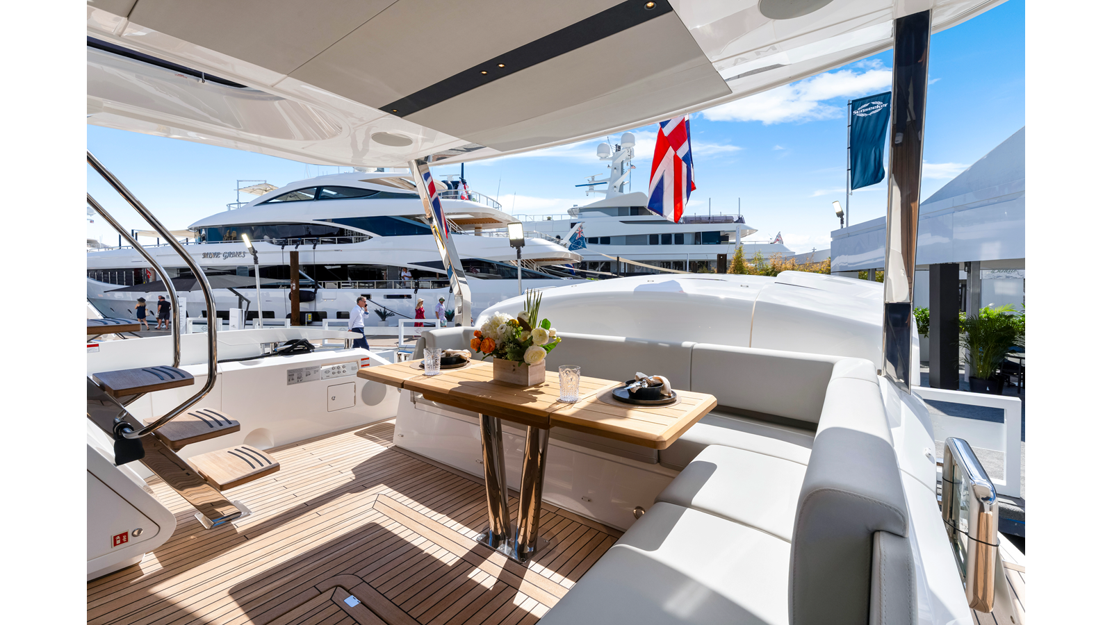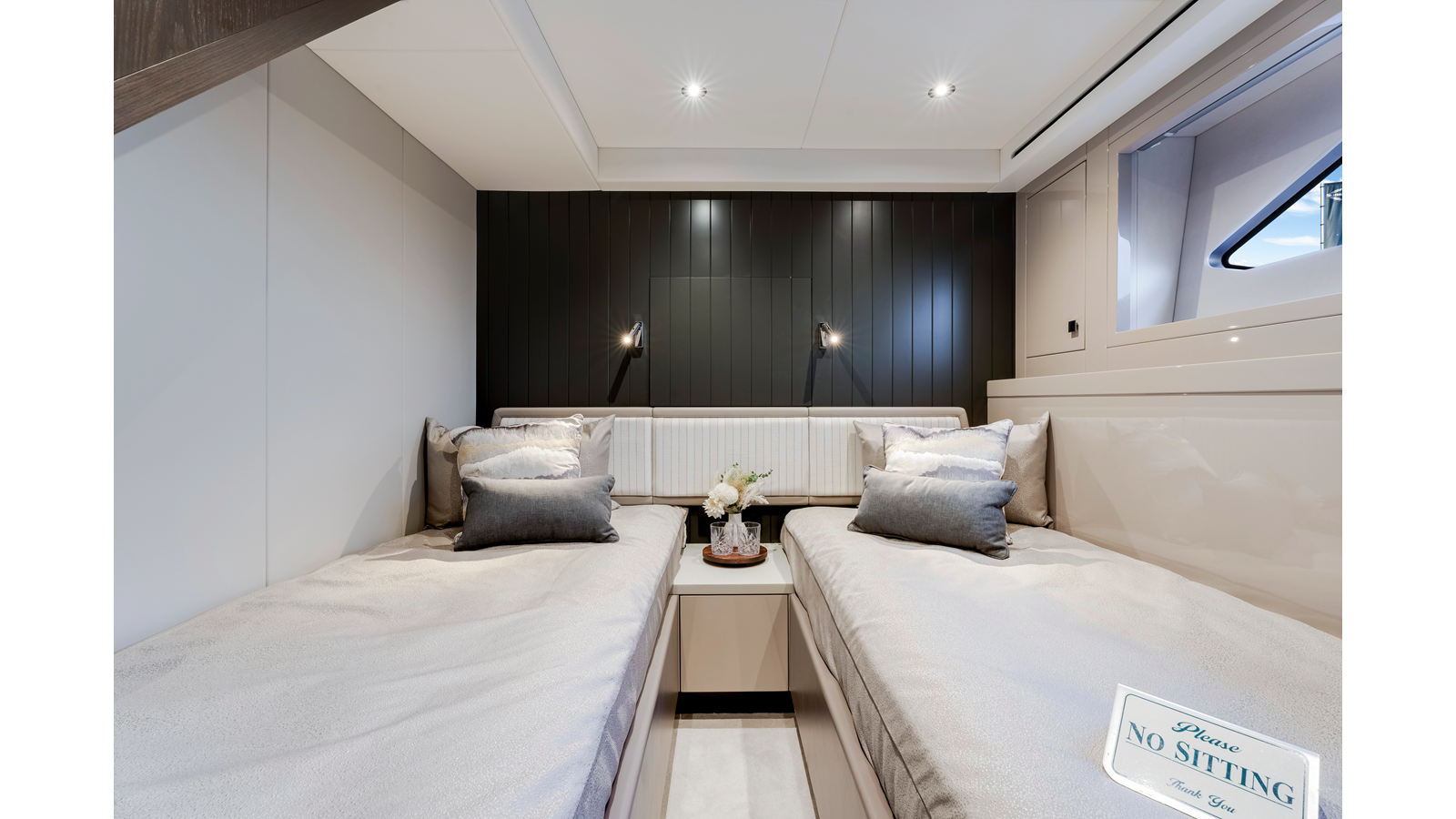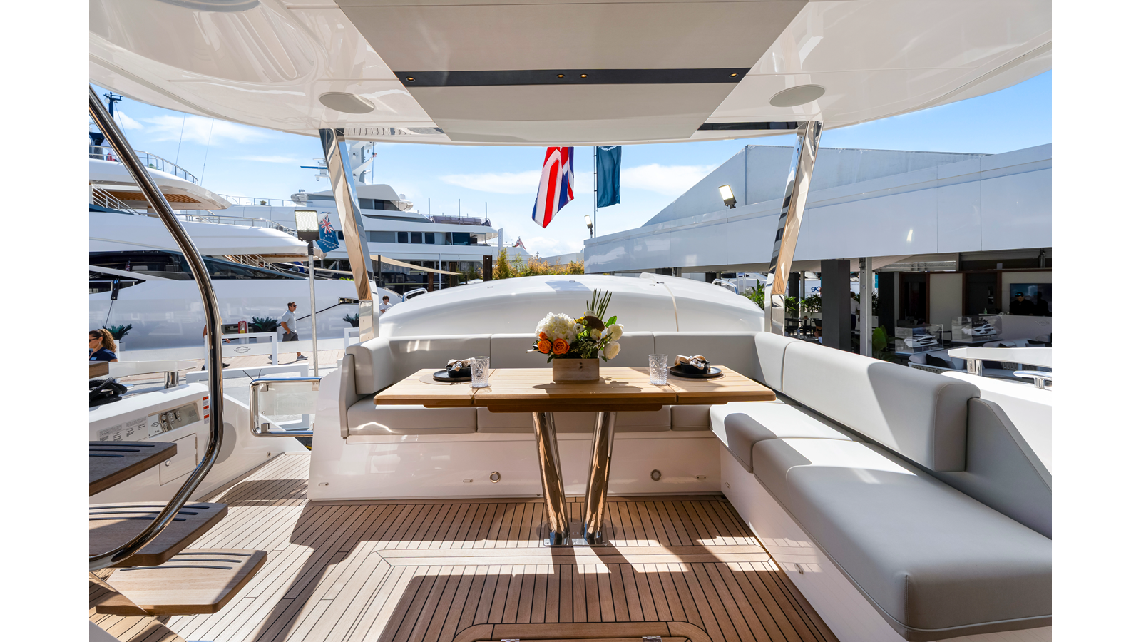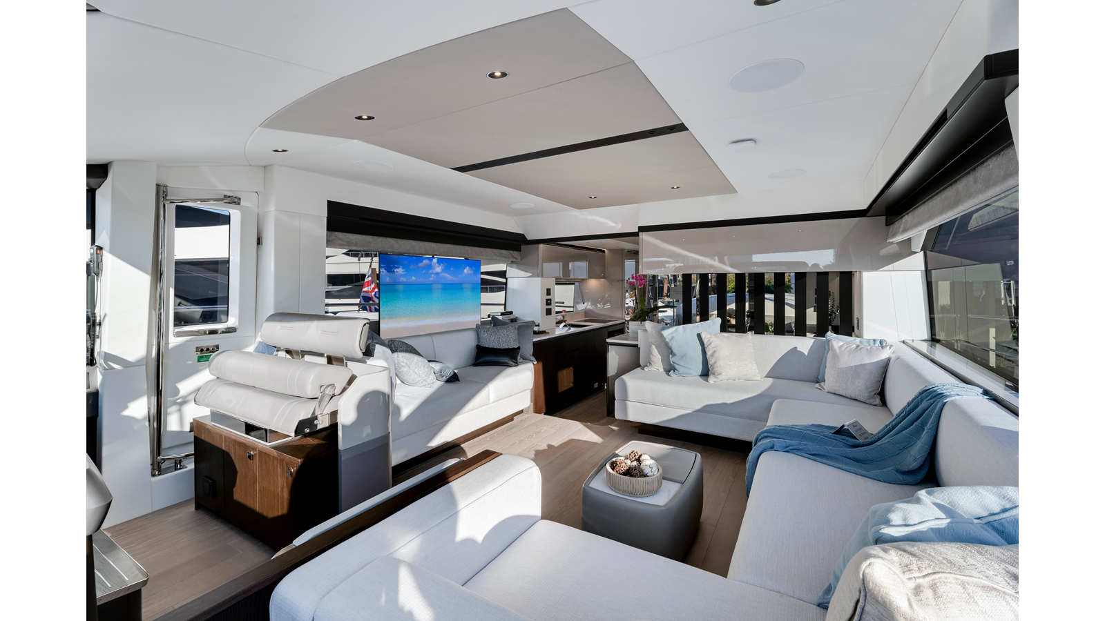 Throughout the main deck, there is a strong focus on creating generous, usable sociable spaces. The exterior lines flow effortlessly from the Portuguese-bridge bow seating and sunbathing areas to the expansive cockpit adjoining an innovative Beach Club with enhanced features, including a dedicated water level locker for two SeaBobs, delivering effortless enjoyment. Internally, the expansive main saloon benefits from sweeping glazing, extending below the TV console, revealing glimpses of the sea from all perspectives.