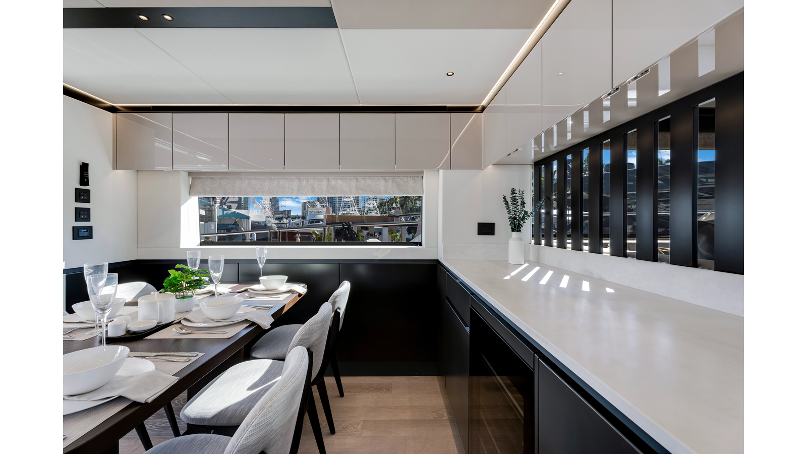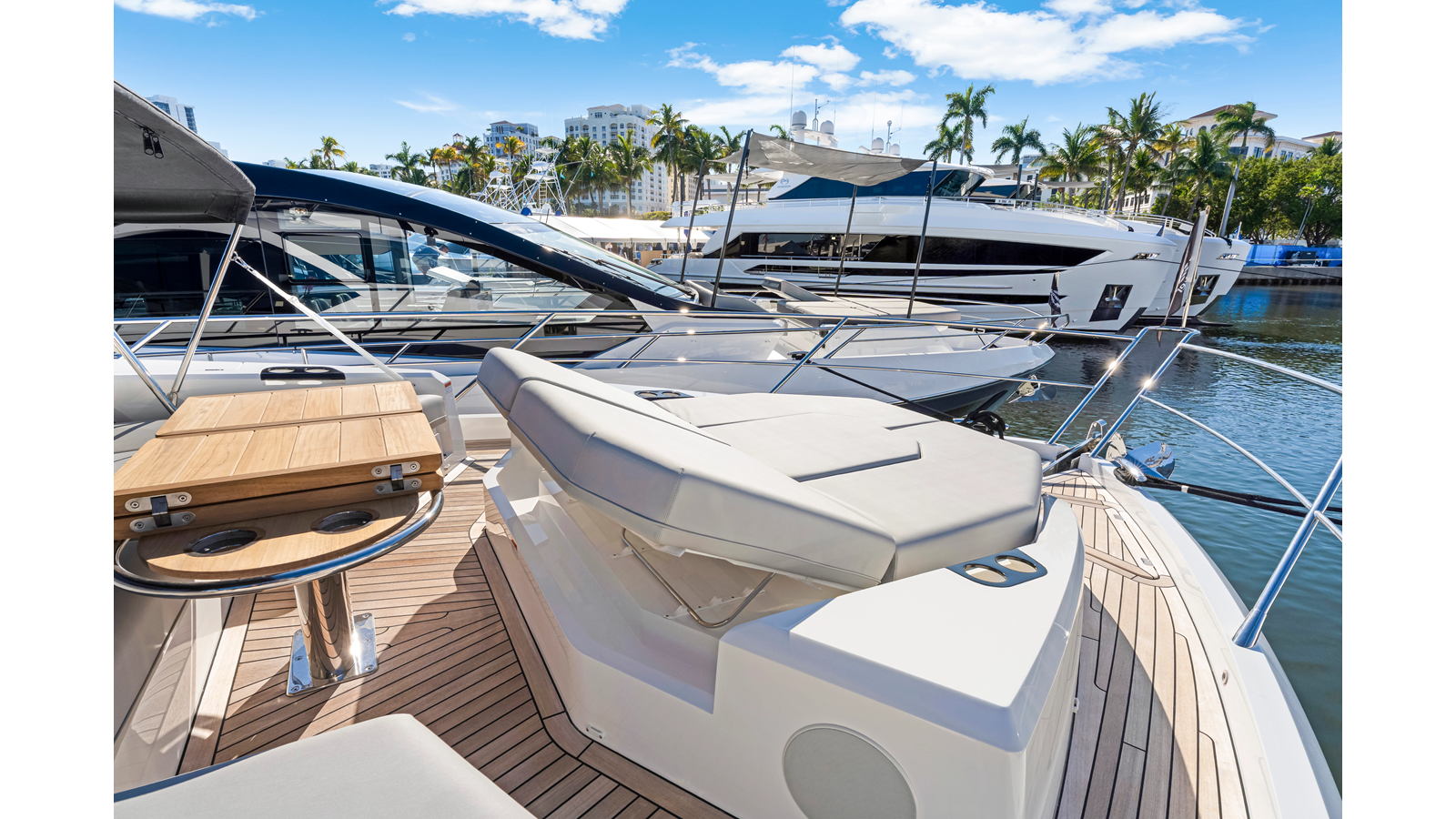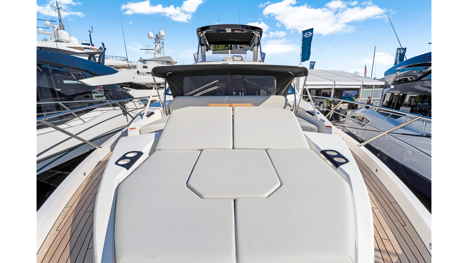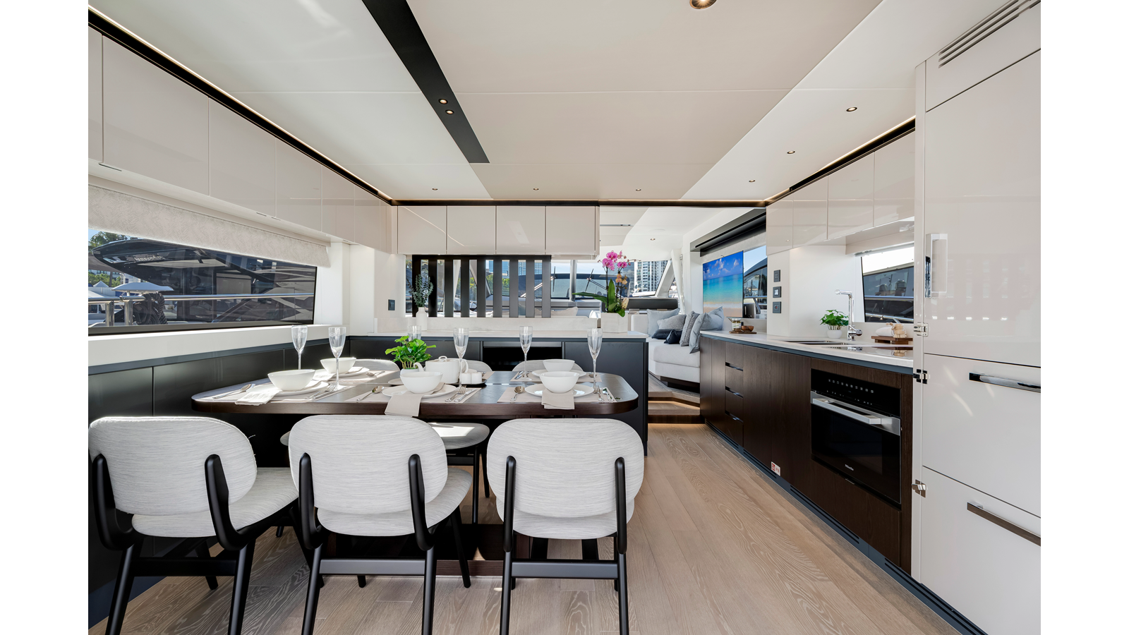 Throughout the main deck, there is a strong focus on creating generous, usable sociable spaces. The exterior lines flow effortlessly from the Portuguese-bridge bow seating and sunbathing areas to the expansive cockpit adjoining an innovative Beach Club with enhanced features, including a dedicated water level locker for two SeaBobs, delivering effortless enjoyment. Internally, the expansive main saloon benefits from sweeping glazing, extending below the TV console, revealing glimpses of the sea from all perspectives.