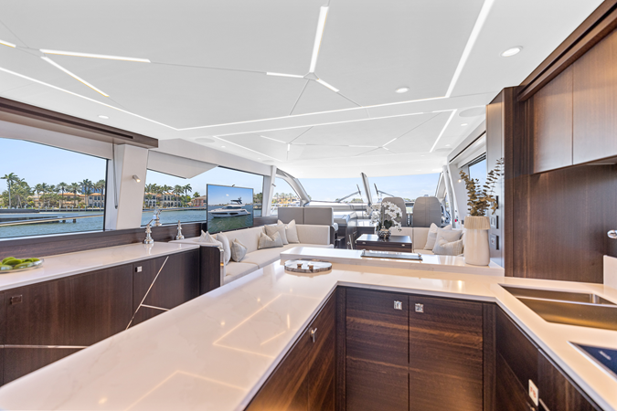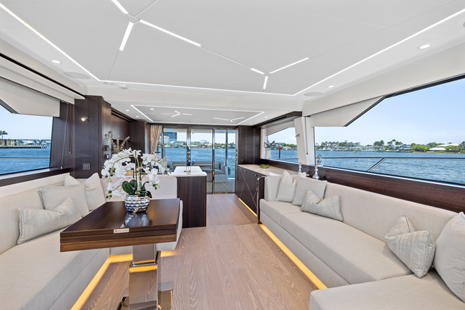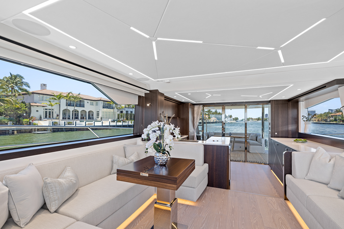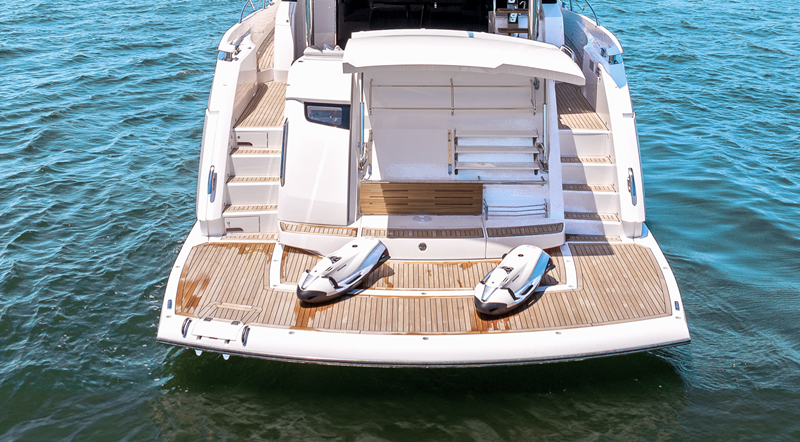 Throughout the main deck, there is a strong focus on creating generous, usable sociable spaces. The exterior lines flow effortlessly from the Portuguese-bridge bow seating and sunbathing areas to the expansive cockpit adjoining an innovative Beach Club with enhanced features, including a dedicated water level locker for two SeaBobs, delivering effortless enjoyment. Internally, the expansive main saloon benefits from sweeping glazing, extending below the TV console, revealing glimpses of the sea from all perspectives.