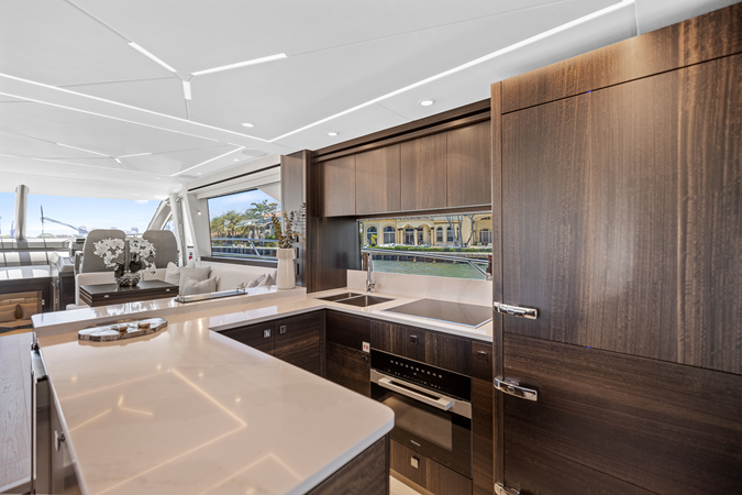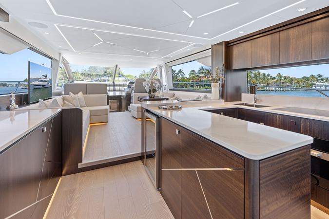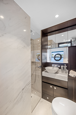 The fully-equipped aft galley with a large dinette links seamlessly to the cockpit via full-width sliding doors, helping to bring everyone together. The innovative design layout allows yachting owners to welcome guests with a strong focus on ambient lighting and interior detailing. Access to the spacious guest and master cabins is via the lower helm and elevated companion seating. The interiors boast exquisite attention to detail with a new palate of upholstery that provides a cool, crisp, and contemporary look, unmistakably a Manhattan.