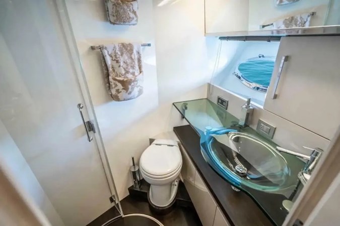 The spacious cockpit and inviting foredeck sun pads provide perfect spots for relaxation, while the impeccably designed interior features neutral tones and a smart layout that accommodates six guests in three well-appointed cabins, each with ensuite facilities and an additional day head for convenience.