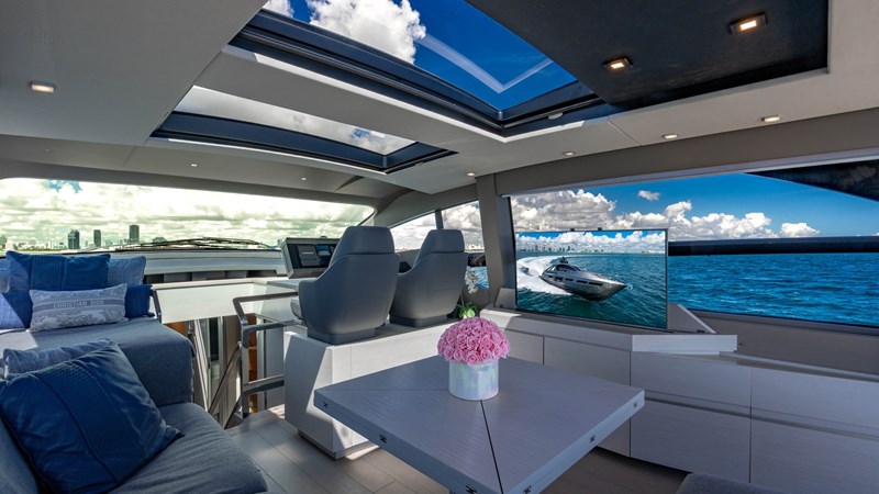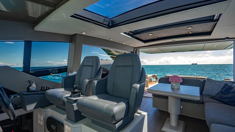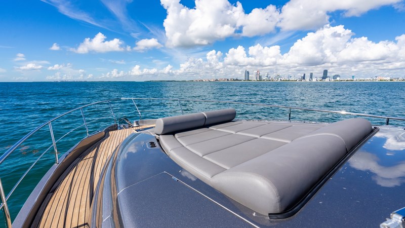 The Pershing 7X model was the winner of ‘Best Exterior Design’ within the 64 – 80ft category at the World Yacht Trophy Awards, and this yacht’s sleek, striking design by Fulvio De Simoni with metallic charcoal hull color is a real head-turner.