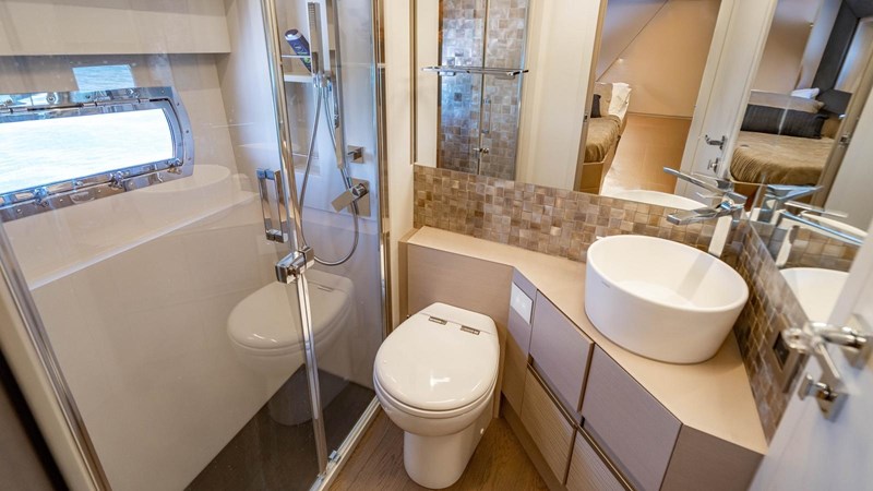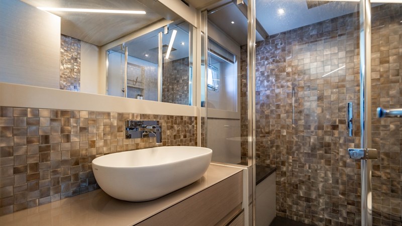 This luxury motor yacht has accommodation for six guests in three cabins. All located on the lower deck, the arrangement comprises a full-beam master suite, VIP double, and a guest twin – all of which are en suite.