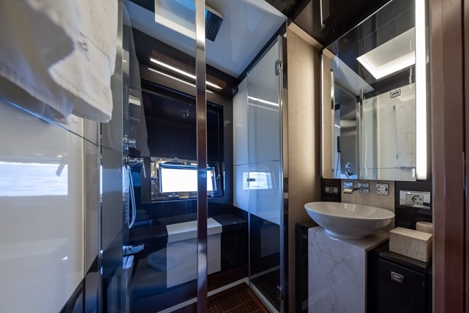 On deck, a spacious bow sunbed invites all-day relaxation, while a mid-ship vertical door and retractable roof seamlessly transform the main deck into an open-air experience.