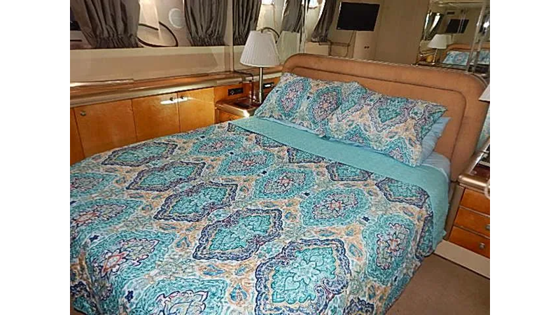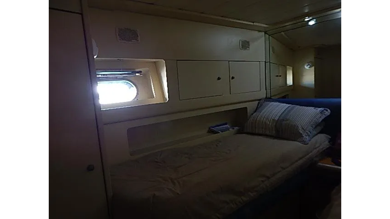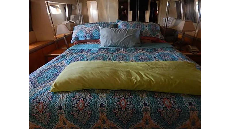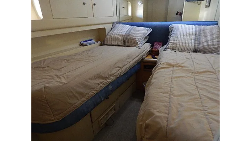 Full beam master, with a king size bed, VIP state room with a queen size bed, guest state room with two single beds, and Captains quarters /office with a single bed, and crew, quarters with two single beds.