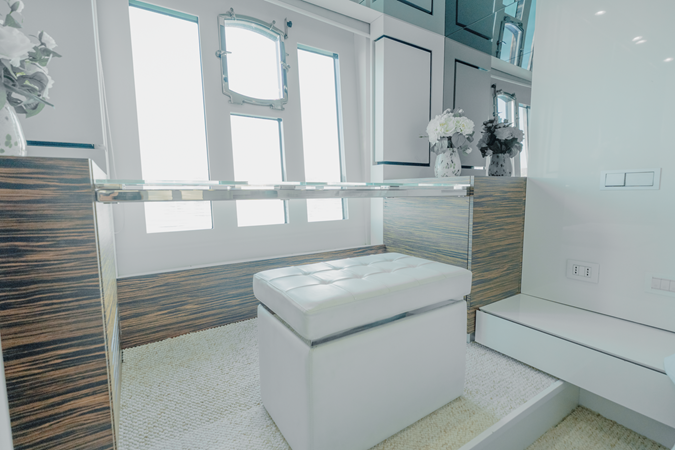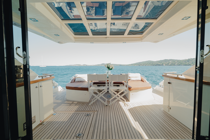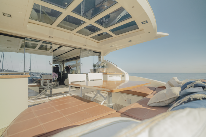 The saloon area which merged into the cockpit has received the most attention, resulting in a spacious entertainment area. The retractable roof, the saloon, and the second hard top above the cockpit can be opened to bathe the area in light and give a great sense of spaciousness.