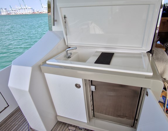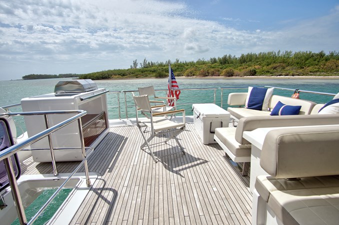 On the main aft deck, guests will find another inviting dining and entertainment area with a high-gloss dining table, built-in seating, a raised portside wet bar with sink and refrigerator, and sliding glass doors leading to the salon. A starboard aft docking station with throttle and bow/stern thruster controls provides convenient maneuvering capabilities.
