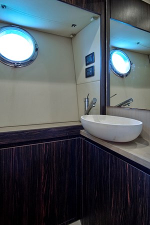 The yacht is fully outfitted for extended cruising, featuring a water maker, hydraulic swim platform, and an expansive flybridge designed for relaxation and entertainment. Multiple seating, lounging, and dining options complement the vessel’s open, contemporary interior layout. The main level features an aft salon, center galley, dedicated dining area, forward interior helm, and below deck, a four-stateroom layout—each with its own ensuite bath. Crew quarters are accessed portside from the rear and include two berths and dedicated storage.