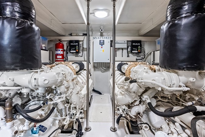 Powered by twin MAN V12 engines, each delivering 1,400 horsepower, allowing the yacht to reach a top speed of approximately 32 knots and a cruising speed of around 26 knots. Advanced technology, including the latest navigation systems and joystick controls, ensures precise maneuverability, making it easy to handle despite its size. The vessel is also equipped with Seakeeper 16 gyro stabilizer, which significantly reduce roll motion, enhancing onboard comfort both at anchor and underway.