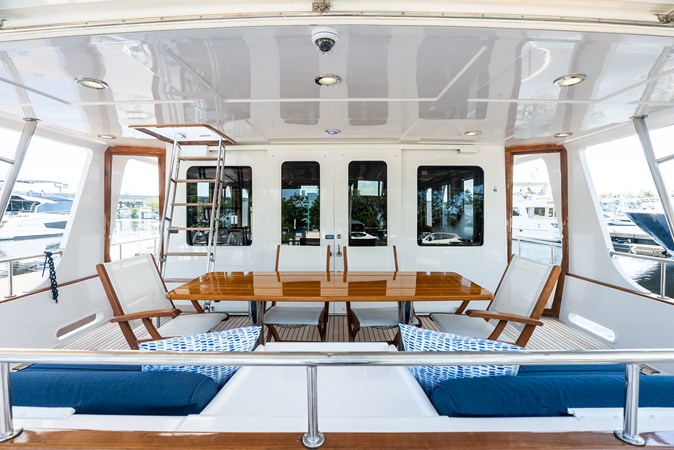 The aft deck features spacious built-in seating with ample storage underneath, centered around a beautiful custom high-gloss teak table with decorative inlays and two fold-down leaves, accompanied by four teak chairs. To port, stainless steel stairs with teak treads lead to the flybridge, while wing doors on both sides protect the cockpit from wind and rough weather.