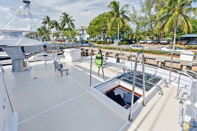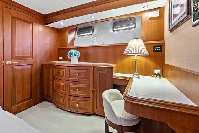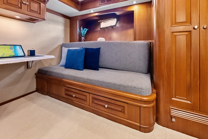 Below the main deck, accessed via teak and holly steps, are the accommodations. The full-beam master stateroom is amidships, boasting a king-size centerline berth, ample amenities, and an en-suite head. The VIP stateroom offers a queen-size island berth with an en-suite head. The third stateroom is custom-designed to convert easily between a double berth and an office. The crew cabin/extra berth is forward of the engine room with direct access from the port side deck.