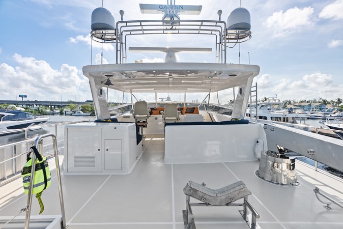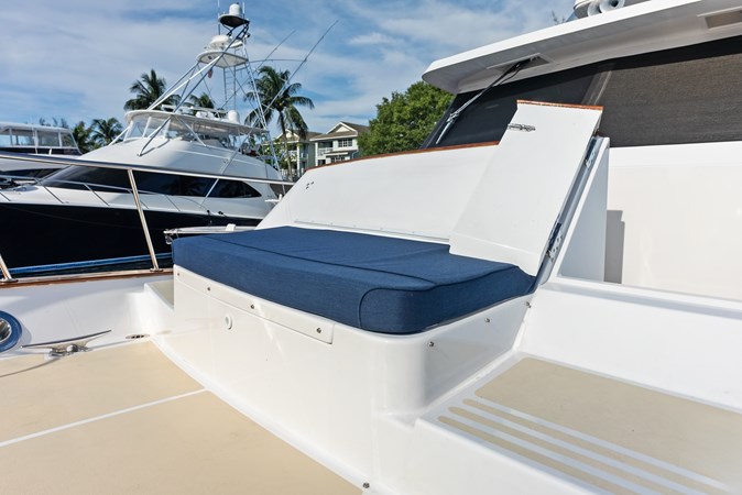The expansive flybridge is accessible from both interior and exterior stairs. It features sofas to port and starboard with teak-topped tables just aft of the helm station, two captain’s chairs, and plentiful storage with Davit Crane.