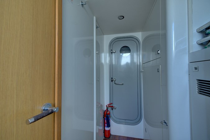 Aft, the crew cabin includes a private head and shower, engine-room access, and is currently arranged with a single berth and additional storage, with the option to reinstall a second bunk.
