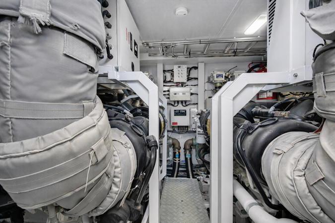 The interior is finished in satin Light Oak with upgraded “Platinum” leather upholstery and enhanced carpeting. The saloon is bright and open with multiple lounging spaces. The galley and dinette feature Wenge wood flooring and can be closed off for privacy.