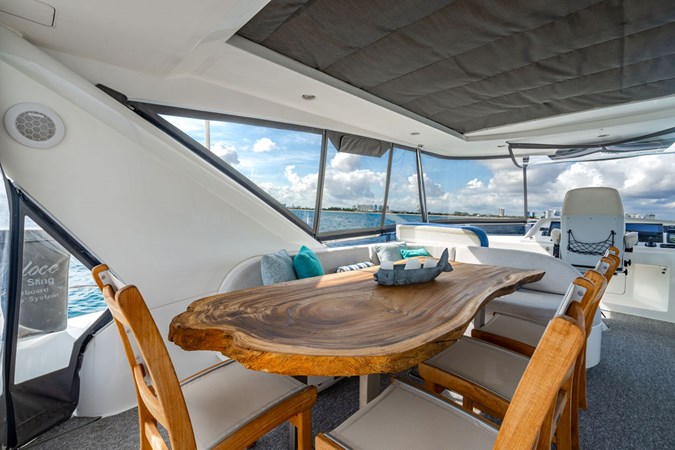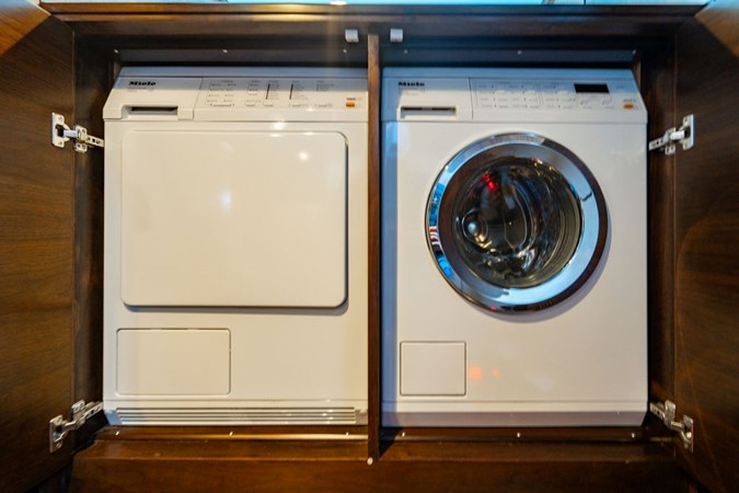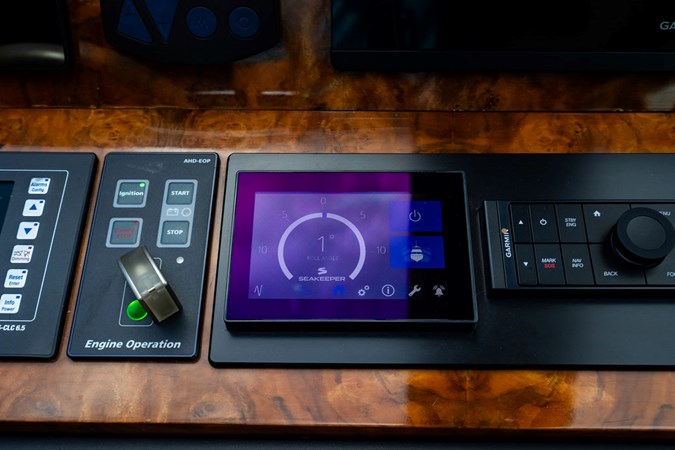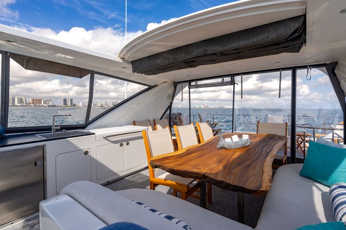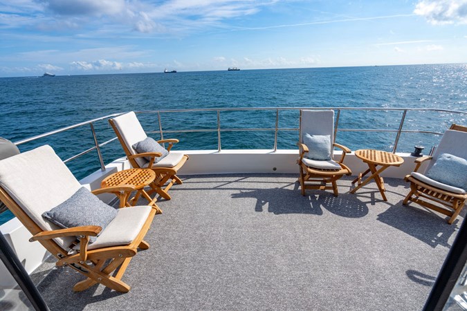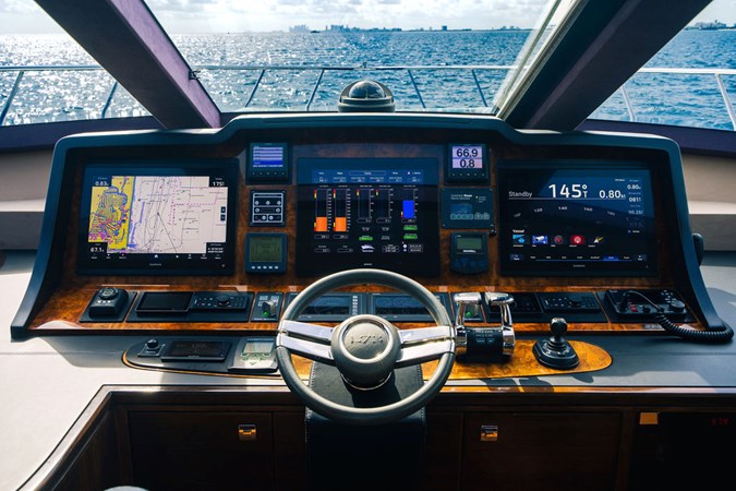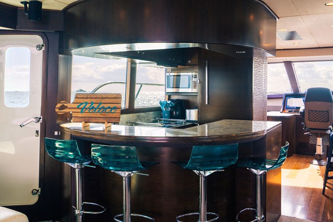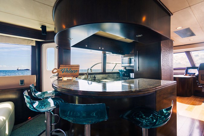 The on-deck galley features walnut flooring and stone countertops. Galley equipment includes: Miele three burner ceramic cook top, Miele oven, Miele built in ventilation hood, Miele dishwasher and Subzero refrigerator with two drawer freezers.