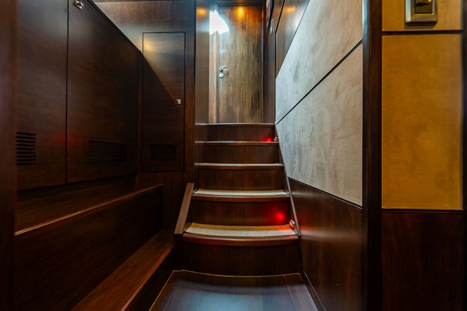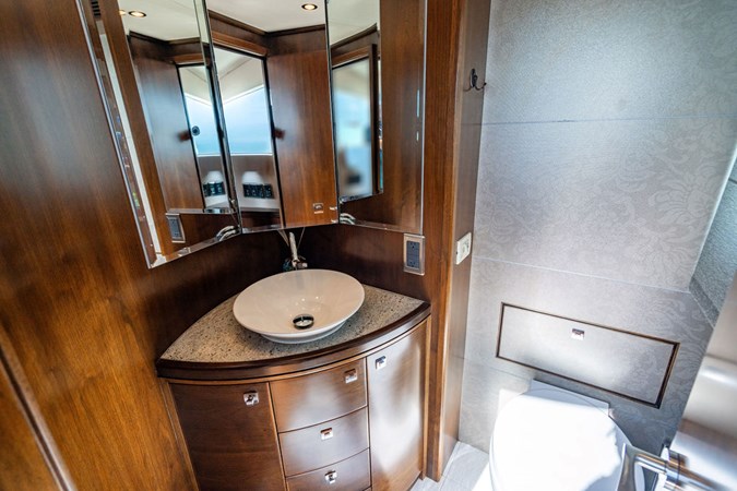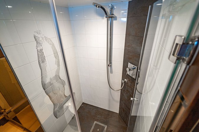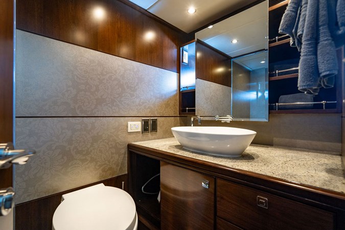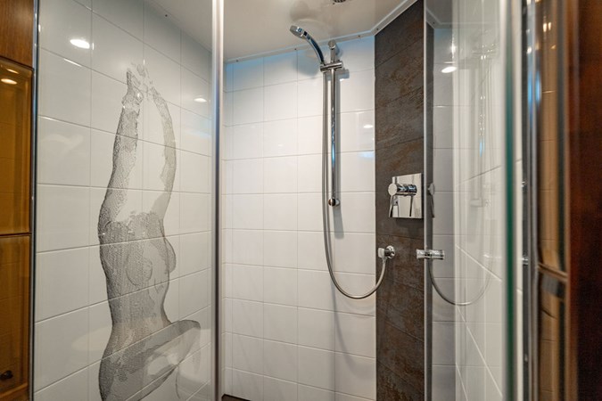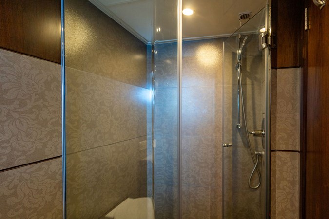 The two guest VIP staterooms are located aft, on port and starboard sides. Each stateroom is fitted with custom queen-sized beds, TV, air conditioning and ensuite heads. The heads feature large glass enclosed showers and Techma heads.