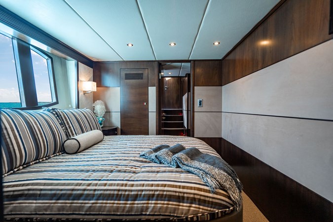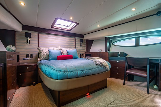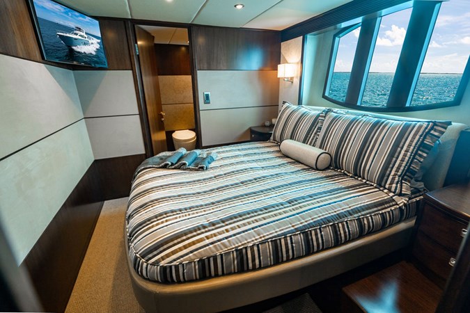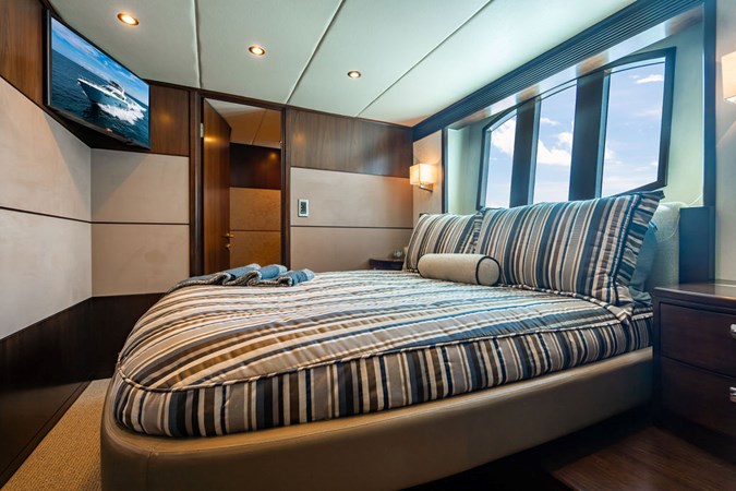 The master stateroom is fitted with a custom king-sized bed, ample storage, nightstands, cabinets, and TV.