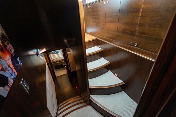 The interior is finished with rich walnut cabinetry, walnut and carpeted flooring, custom stone counter tops and a tasteful blend of rich fabrics.