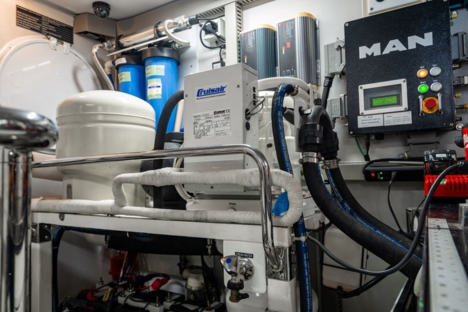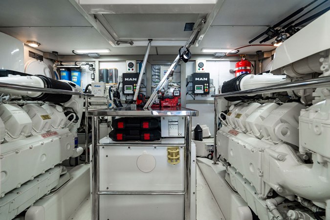 Power is provided by a pair of MAN V-8 1200hp engines with ZF Pod Drives. This combination provides great performance and ease of control.