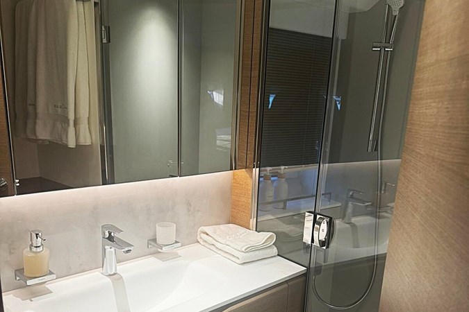 With a top speed of 35 knots and cruising at 30 knots , Solomon offers fast, quiet, and comfortable stabilized passages. Her 4 ensuite guest cabins include a full-beam master suite , VIP forward, and two convertible twins — ideal for families or guests. Aft crew quarters accommodate two, with private access. All with the refined style for which Princess Yachts are known.