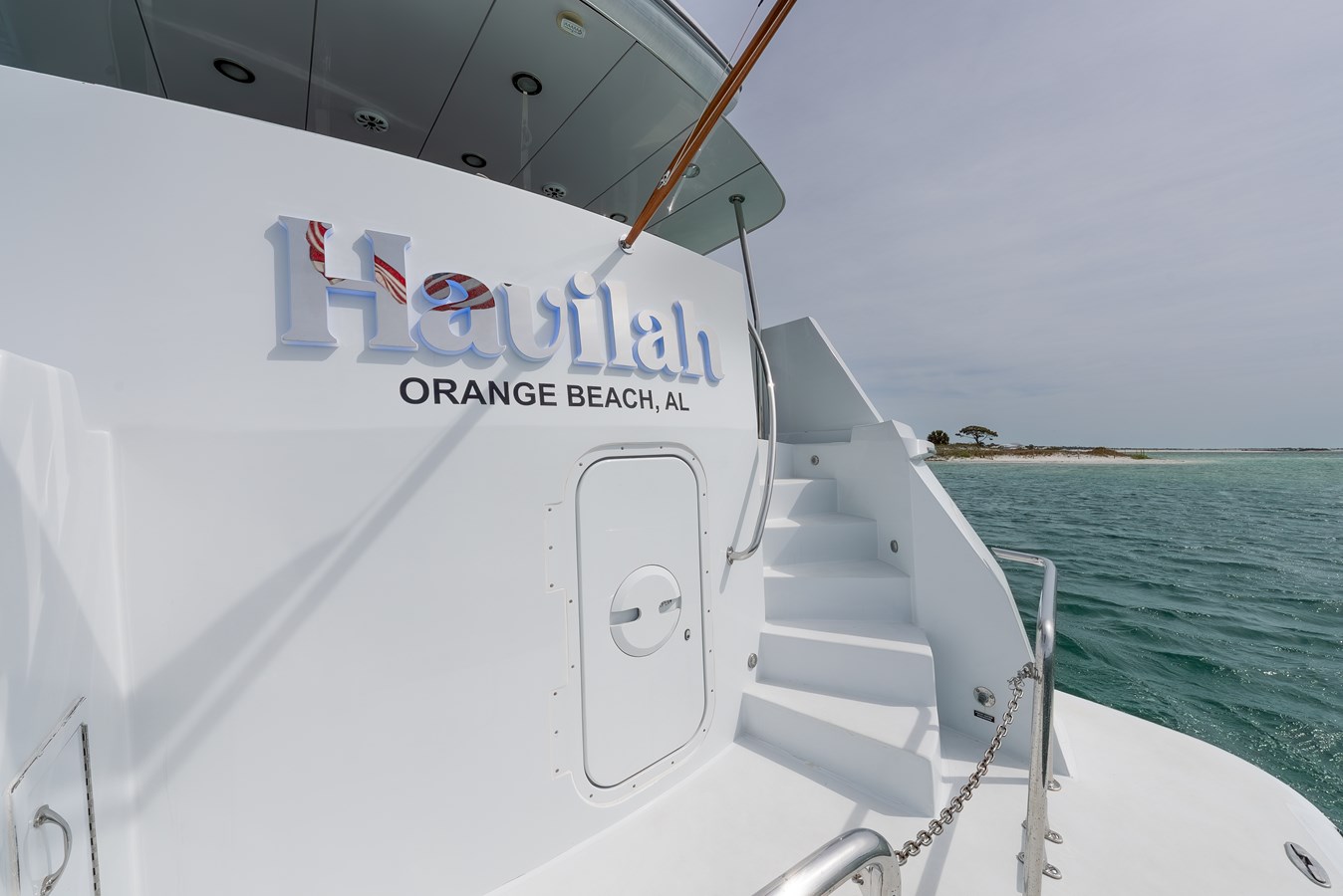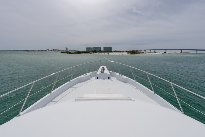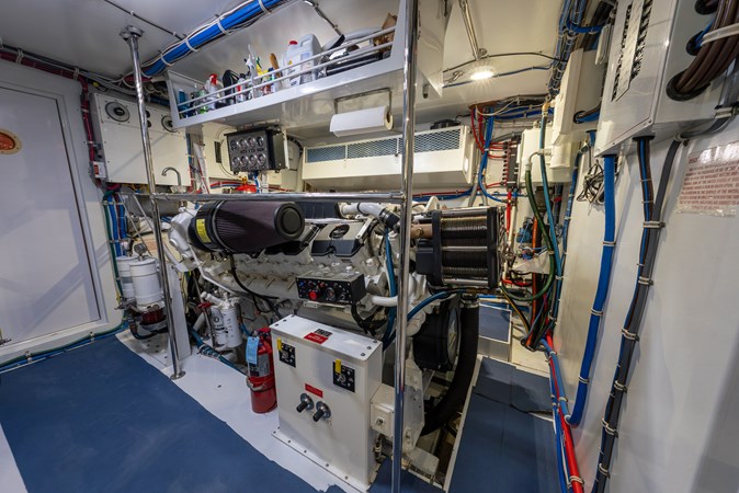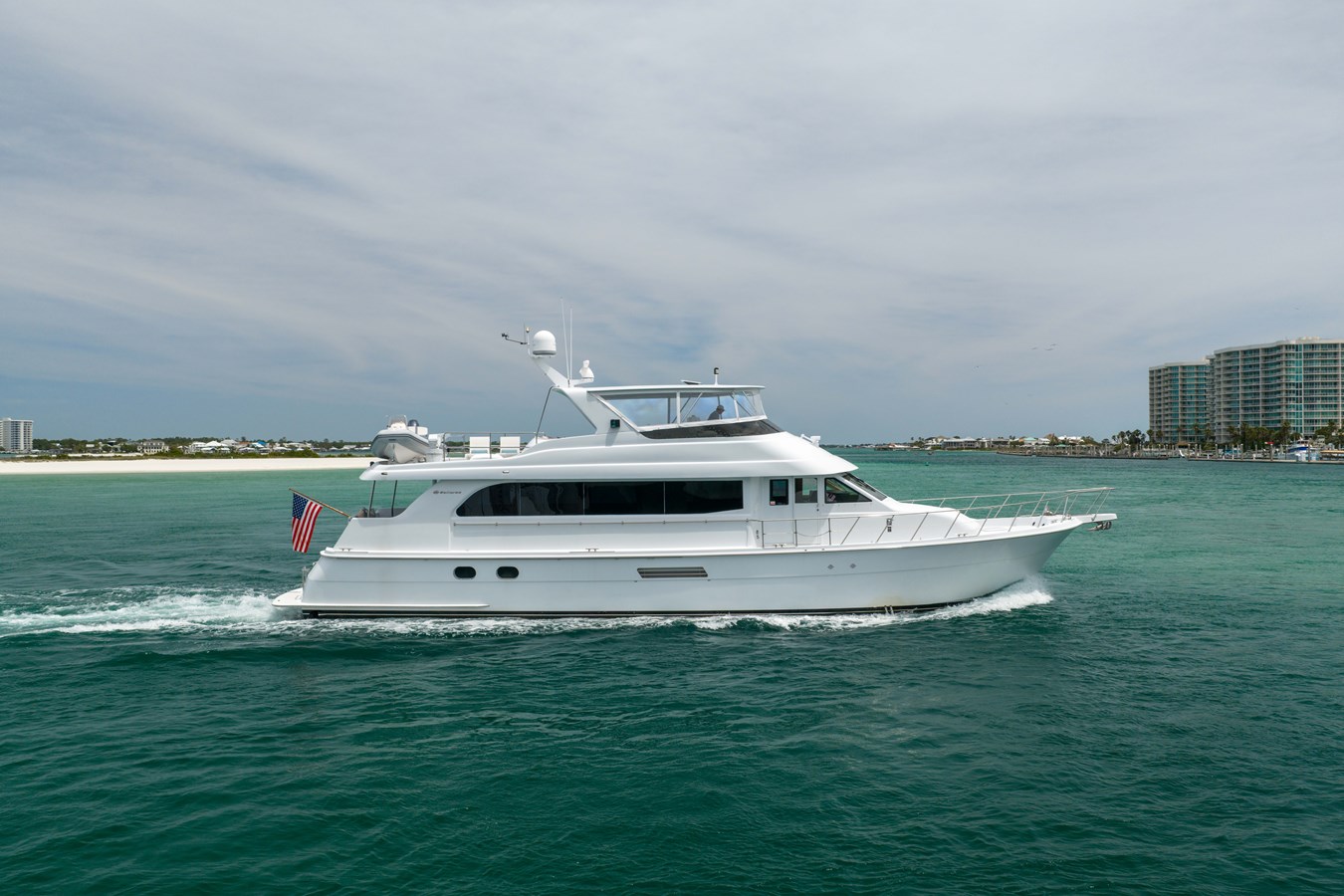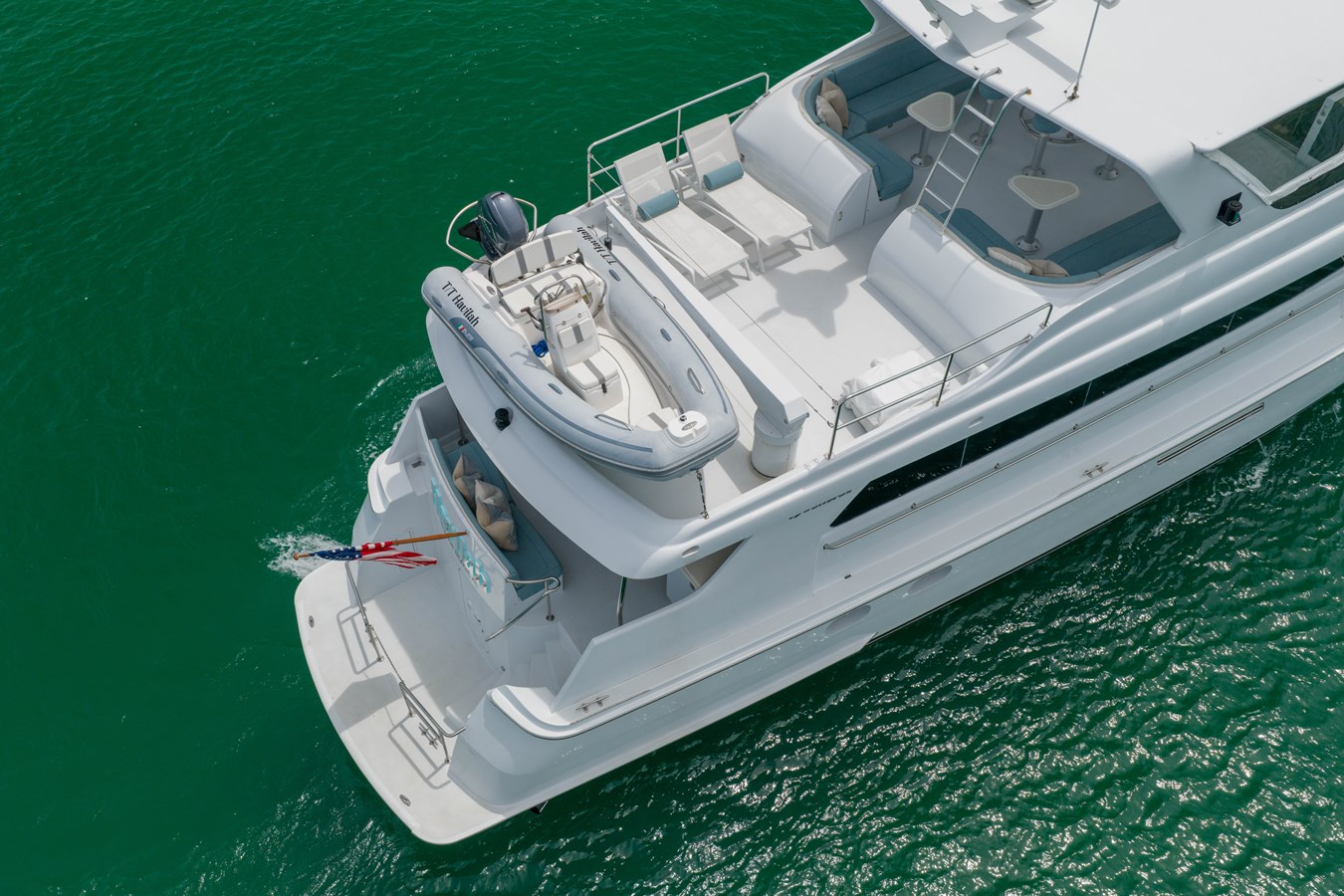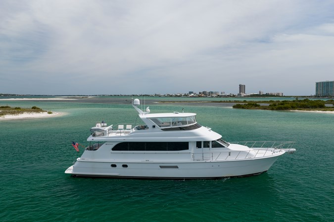 The 2004 Hatteras 75 Sportdeck Motor Yacht, Havilah, is a well-maintained and updated late-model vessel featuring twin Caterpillar C30 engines (1,550 hp each) for a top speed of 28 knots and a cruise speed of 22 knots. Efficient hull-down cruising runs at 11.5 knots with a 25 gph fuel burn. Stabilization is managed by a NAIAD MultiSea II fin system.